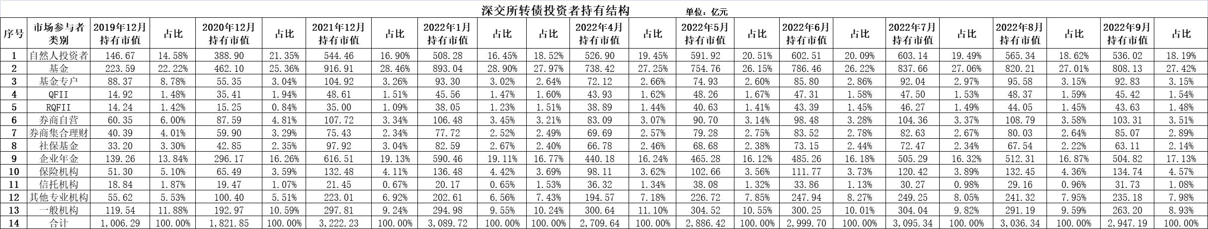 2022年9月,深交所转债投资者持有市值(债券市值)2,947.19 亿元,其中基金(公募)持有市值占比27.42%,其他专业机构(私募)持有市值占比7.98%,自然人投资者持有市值占比18.19%。