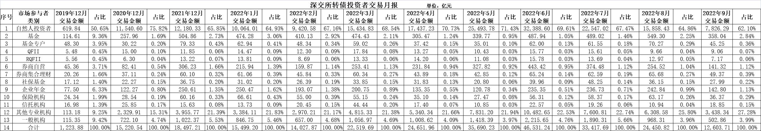 2022年9月,深交所转债投资者交易金额12,603.71亿元,其中基金(公募)交易金额占比2.84%,其他专业机构(私募)交易金额占比27.28%,自然人投资者交易金额占比62.10%。