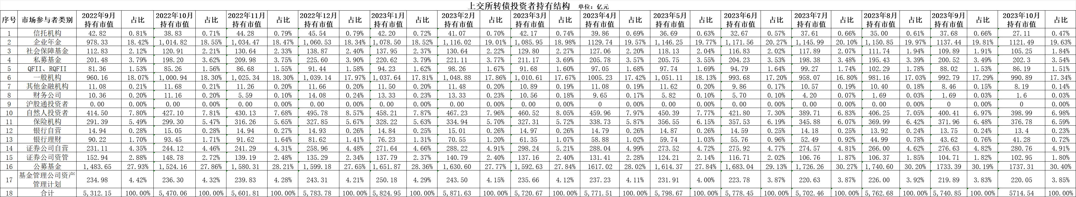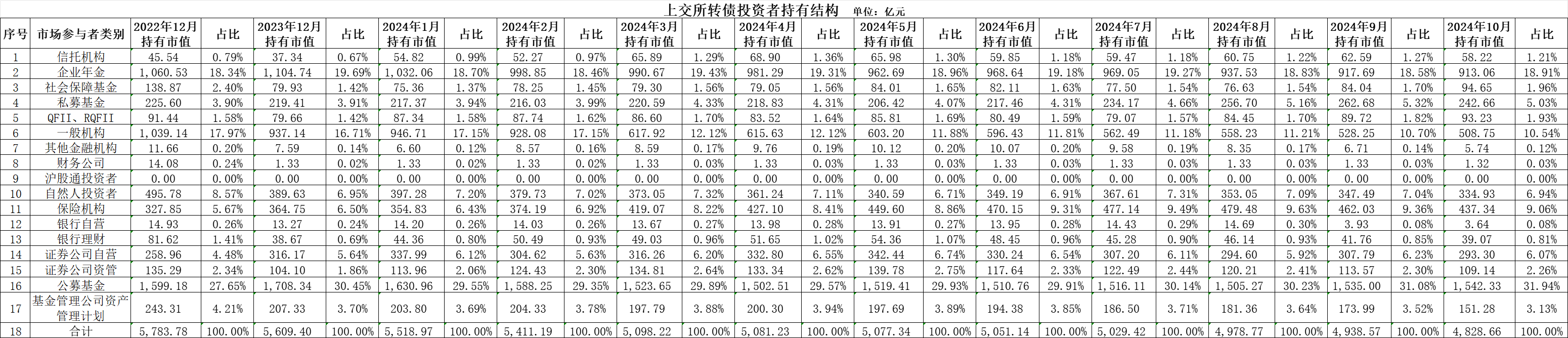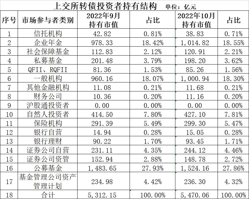 2022年10月,上交所转债投资者持有市值(债券面值)5,470.06 亿元,其中公募基金持有市值占比27.86%,自然人投资者持有市值占比7.81%。