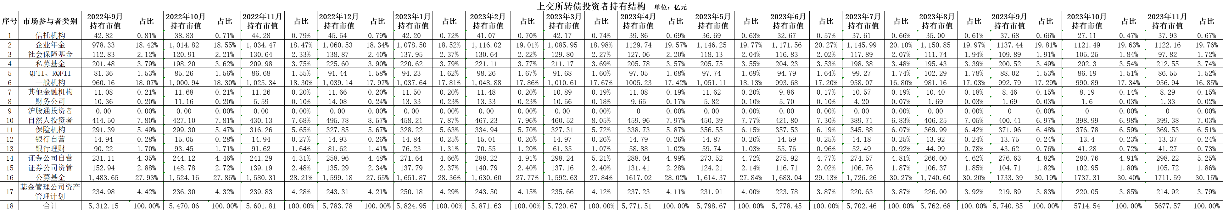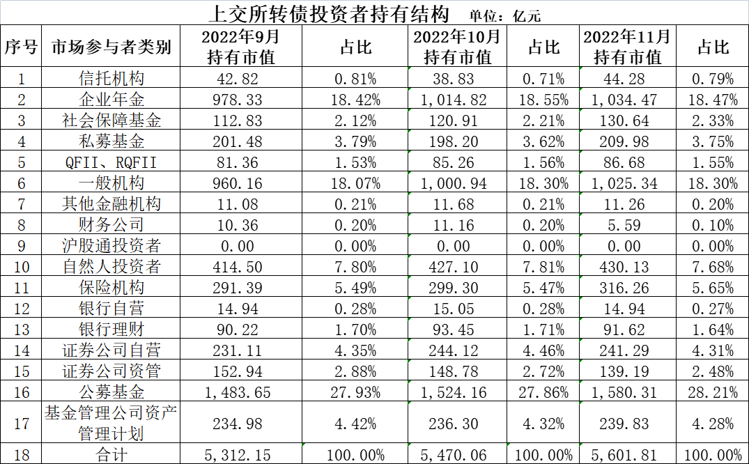 2022年11月,上交所转债投资者持有市值(债券面值)5,601.81 亿元,其中公募基金持有市值占比28.21%,自然人投资者持有市值占比7.68%。