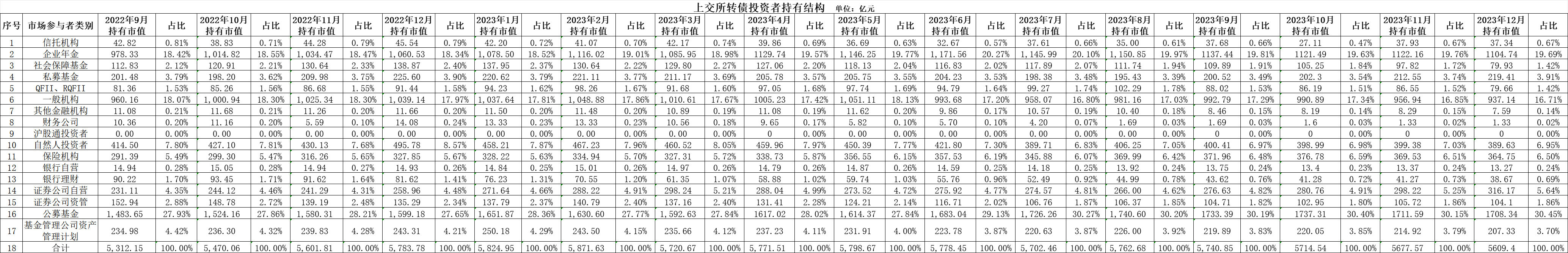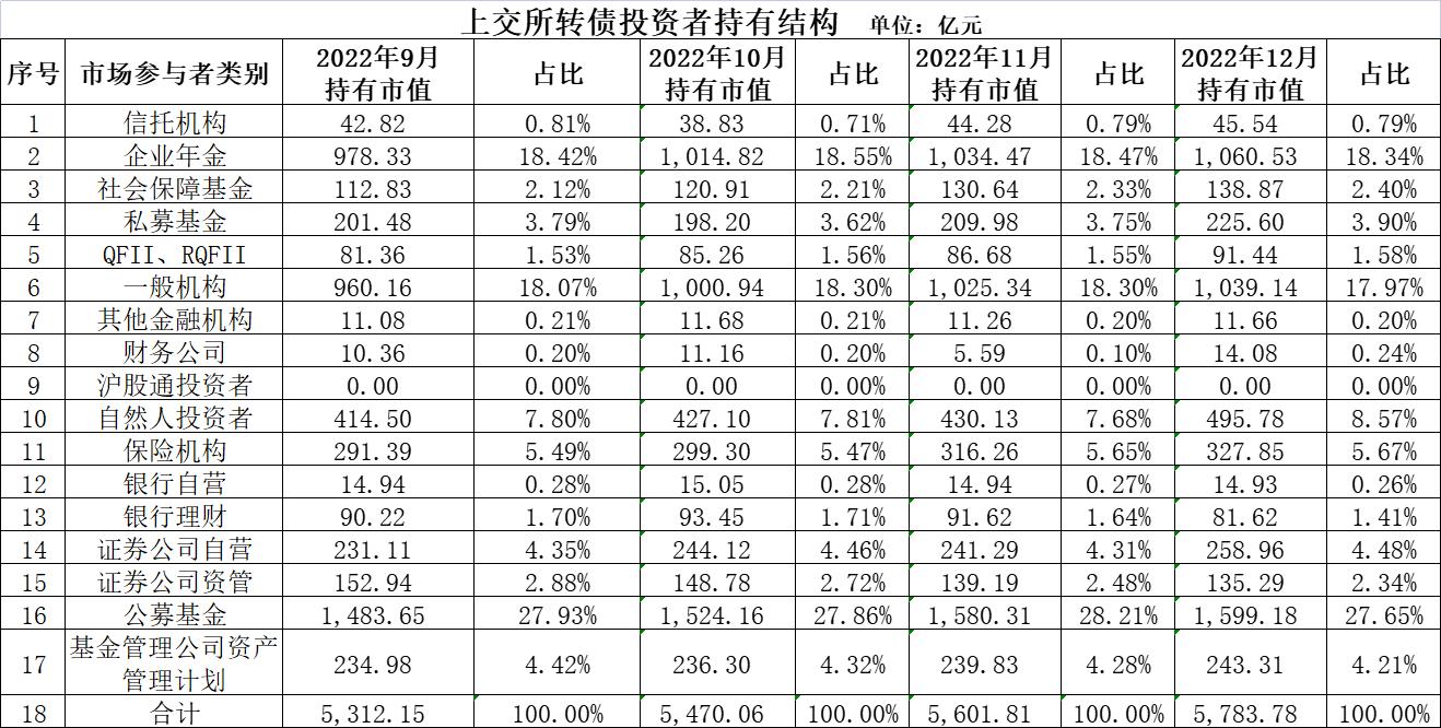 2022年12月,上交所转债投资者持有市值(债券面值)5,783.78 亿元,其中公募基金持有市值占比27.65%,自然人投资者持有市值占比8.57%。