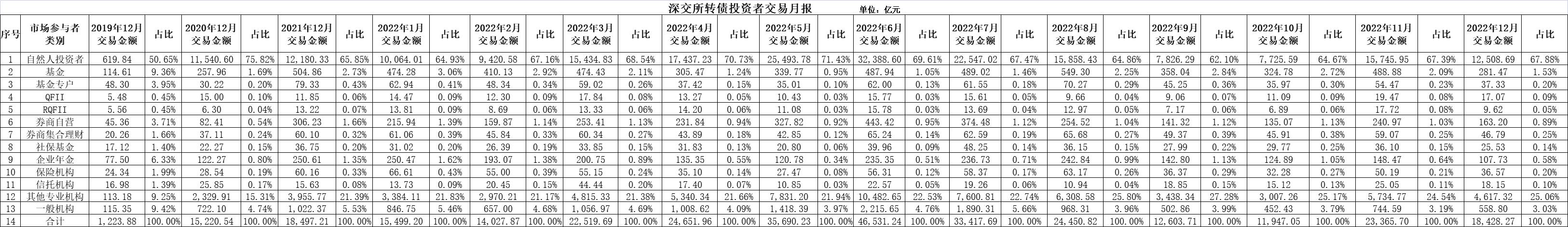 2022年12月,深交所转债投资者交易金额18,428.27亿元,其中基金(公募)交易金额占比1.53%,其他专业机构(私募)交易金额占比25.06%,自然人投资者交易金额占比67.88%。