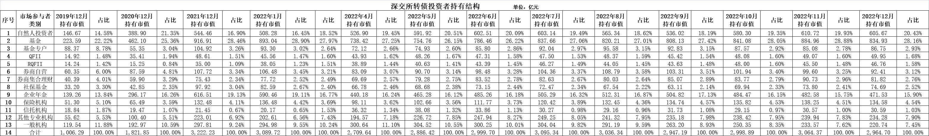 2022年12月,深交所转债投资者持有市值(债券市值)2,964.70 亿元,其中基金(公募)持有市值占比28.16%,其他专业机构(私募)持有市值占比7.9%,自然人投资者持有市值占比20.43%。