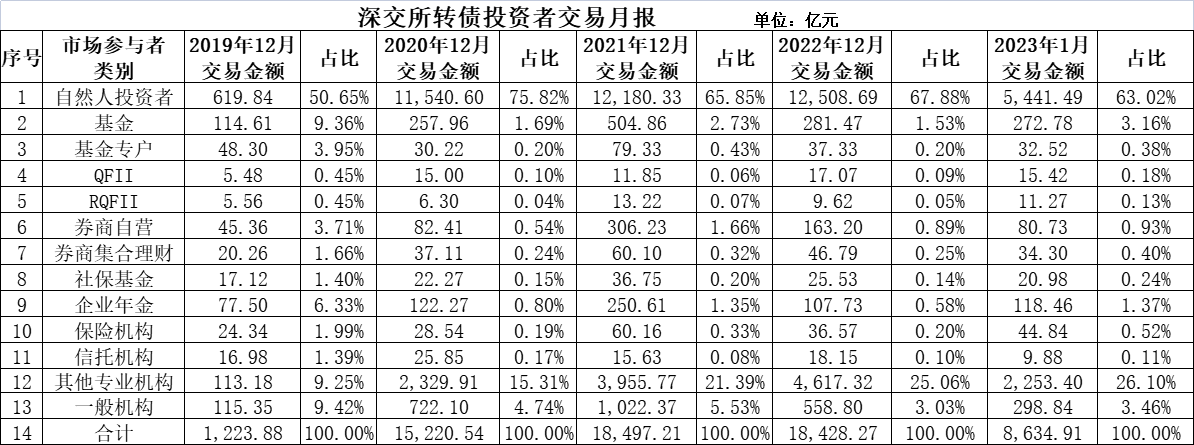 2023年1月,深交所转债投资者交易金额8,634.91亿元,其中基金(公募)交易金额占比3.16%,其他专业机构(私募)交易金额占比26.10%,自然人投资者交易金额占比63.02%。