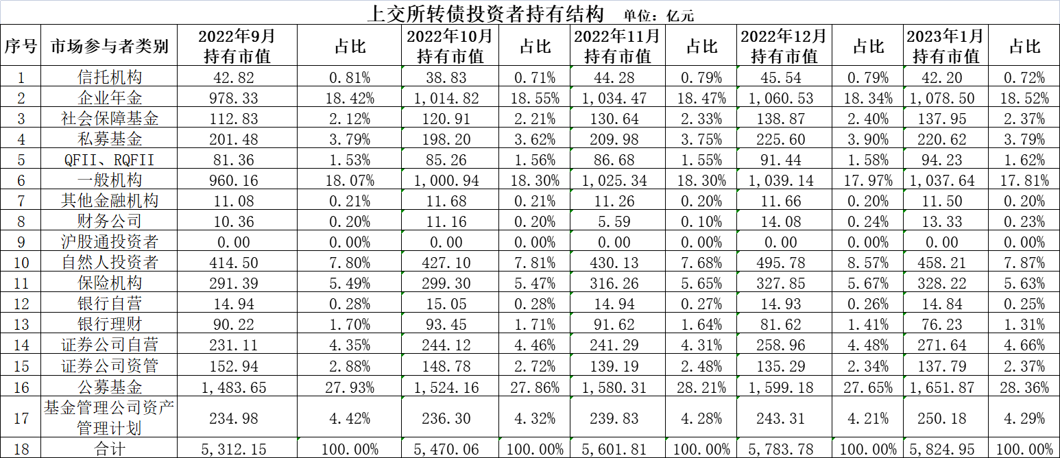2023年1月,上交所转债投资者持有市值(债券面值)5,824.95亿元,其中公募基金持有市值占比28.36%,自然人投资者持有市值占比7.87%。
