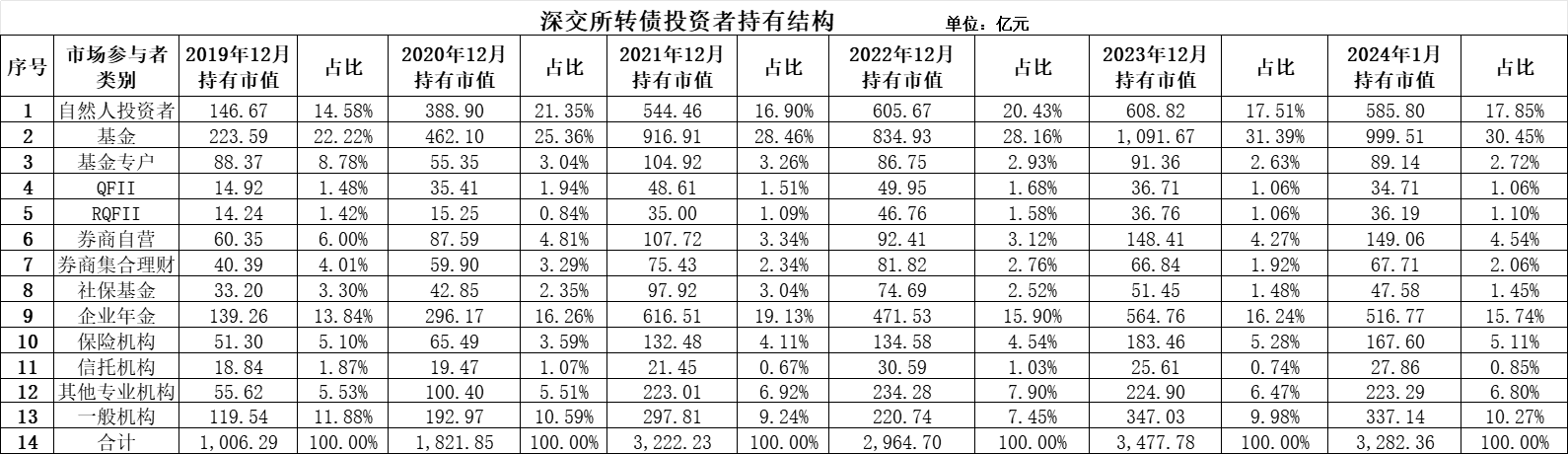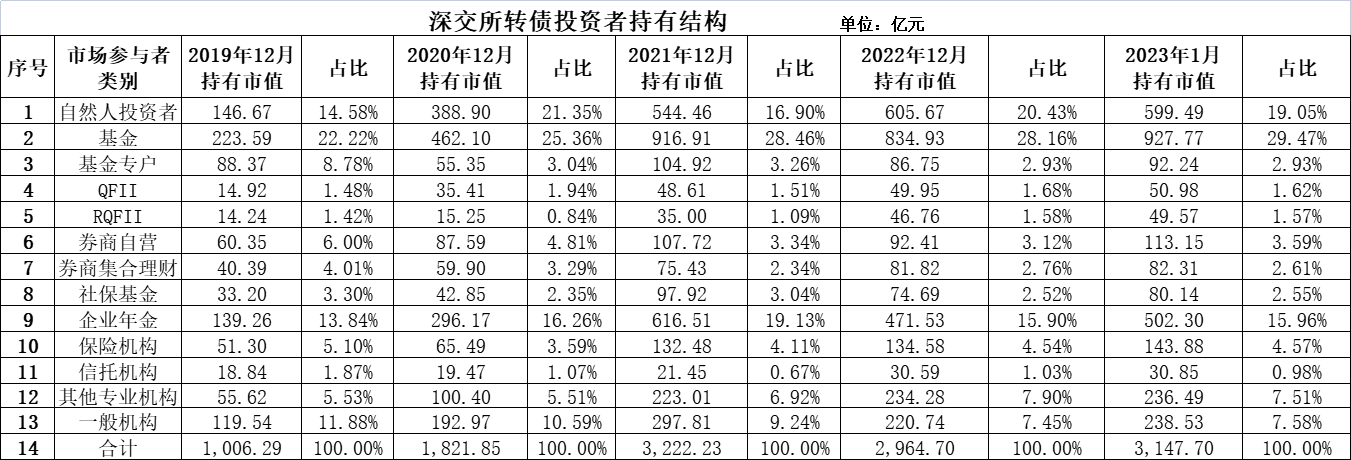 2023年1月,深交所转债投资者持有市值(债券市值)3,147.70 亿元,其中基金(公募)持有市值占比29.47%,其他专业机构(私募)持有市值占比7.51%,自然人投资者持有市值占比19.05%。