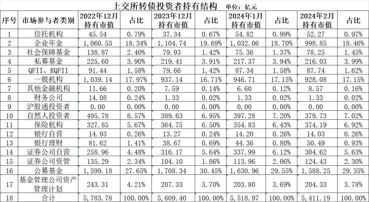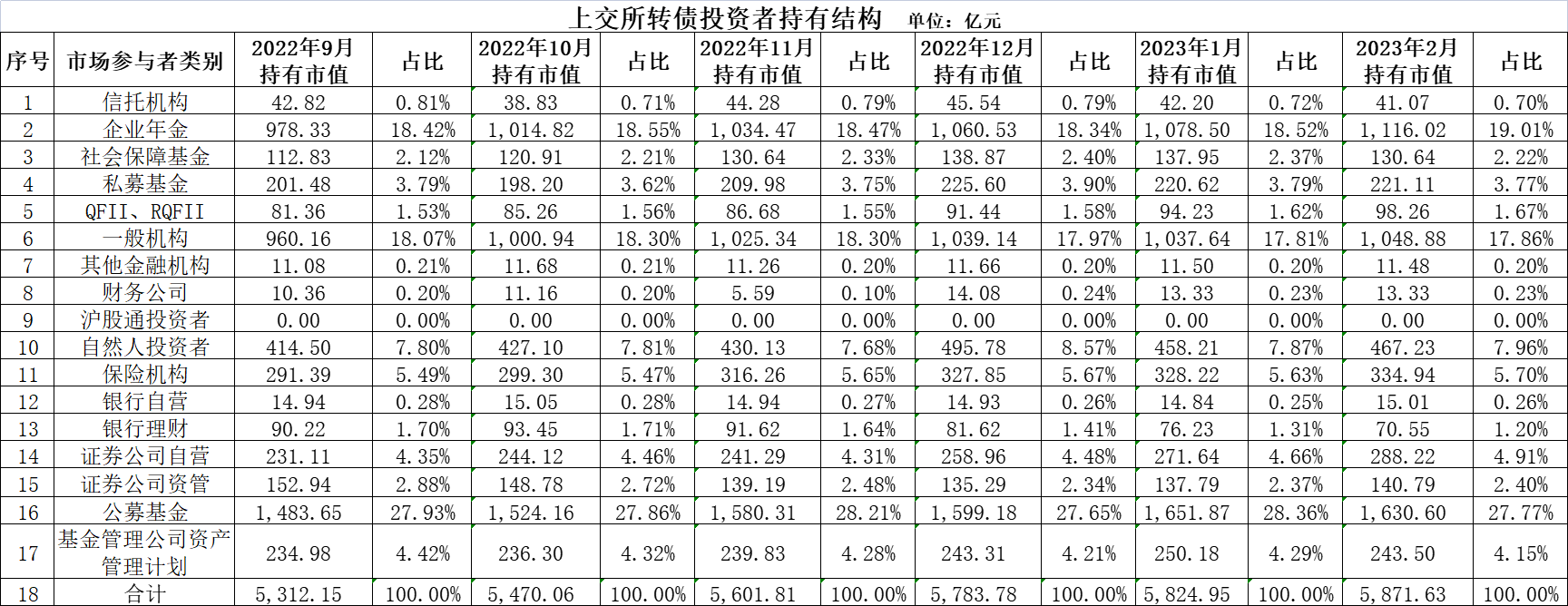 2023年2月,上交所转债投资者持有市值(债券面值)5,871.63 亿元,其中公募基金持有市值占比27.77%,自然人投资者持有市值占比7.96%。