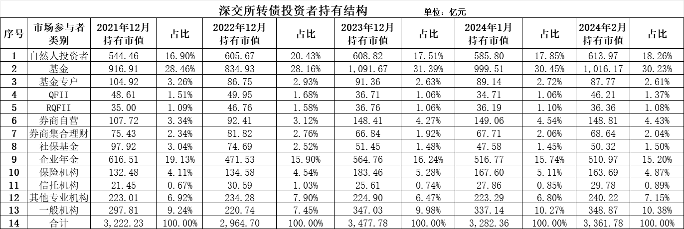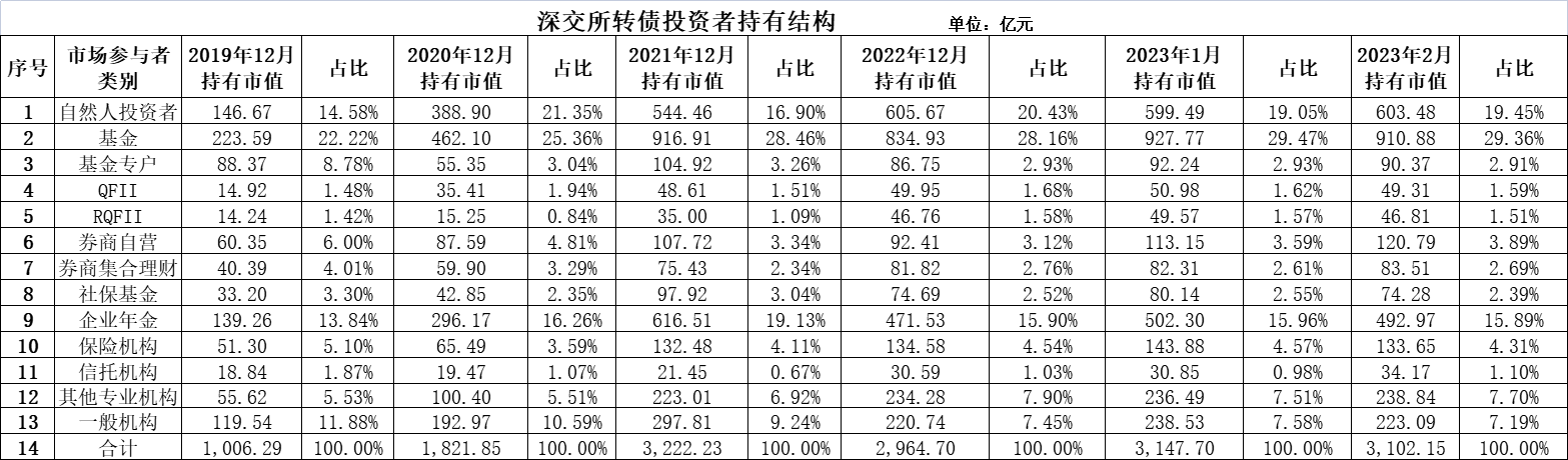 2023年2月,深交所转债投资者持有市值(债券市值)3,102.15 亿元,其中基金(公募)持有市值占比29.36%,其他专业机构(私募)持有市值占比7.70%,自然人投资者持有市值占比19.45%。