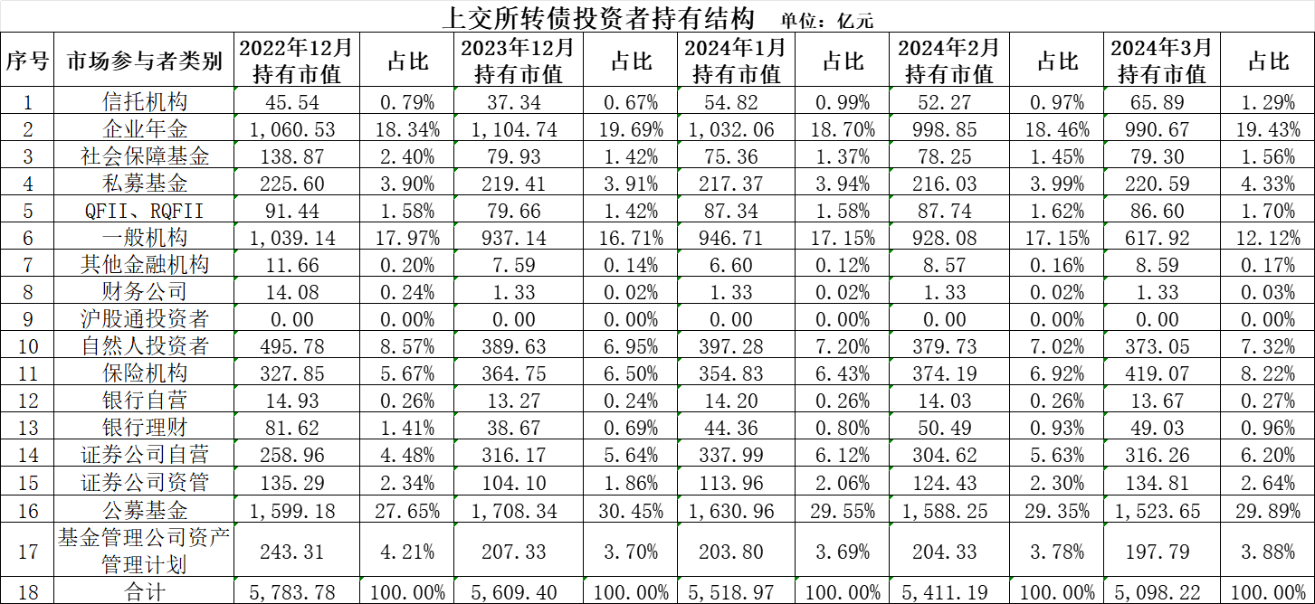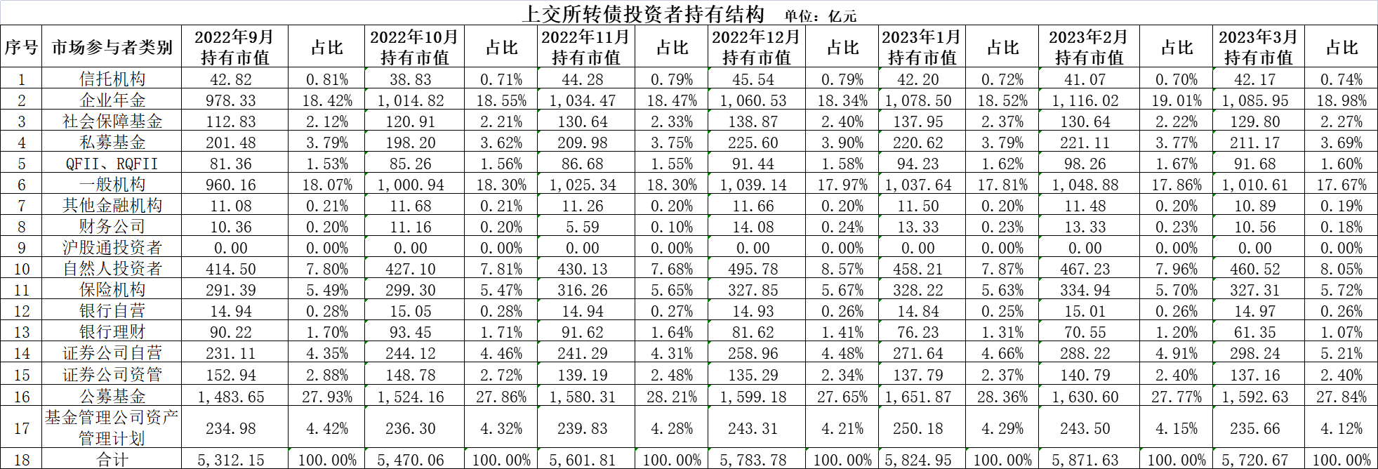 2023年3月,上交所转债投资者持有市值(债券面值)5,720.67 亿元,其中公募基金持有市值占比27.84%,自然人投资者持有市值占比8.05%。
