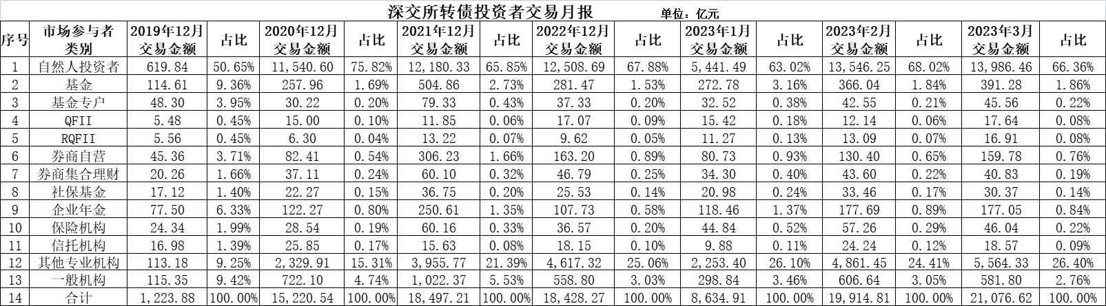 2023年3月,深交所转债投资者交易金额21,076.62亿元,其中基金(公募)交易金额占比1.86%,其他专业机构(私募)交易金额占比26.40%,自然人投资者交易金额占比66.36%。