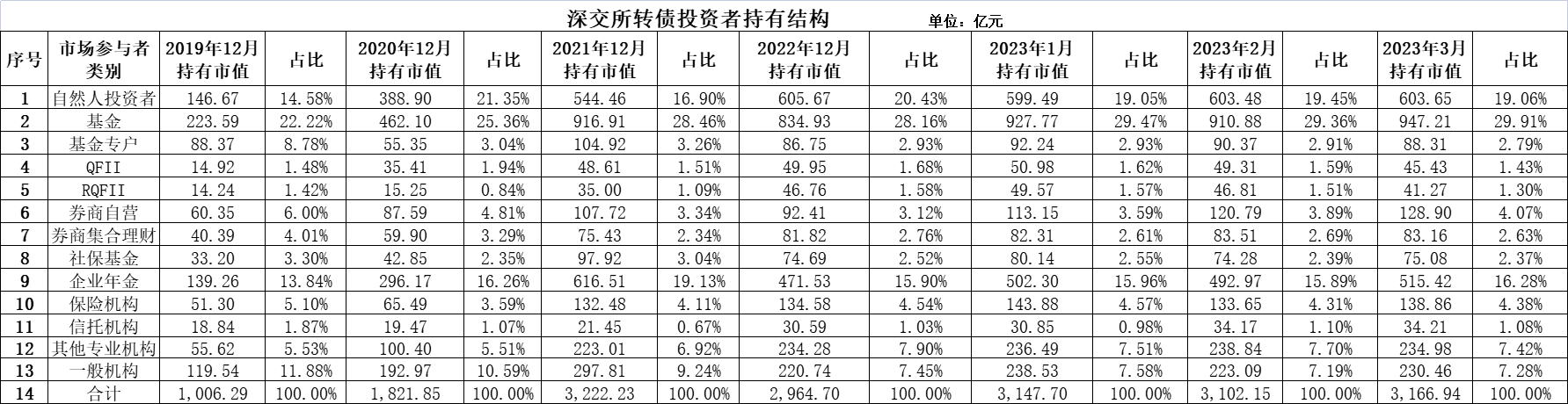 2023年3月,深交所转债投资者持有市值(债券市值)3,166.94 亿元,其中基金(公募)持有市值占比29.91%,其他专业机构(私募)持有市值占比7.42%,自然人投资者持有市值占比19.06%。
