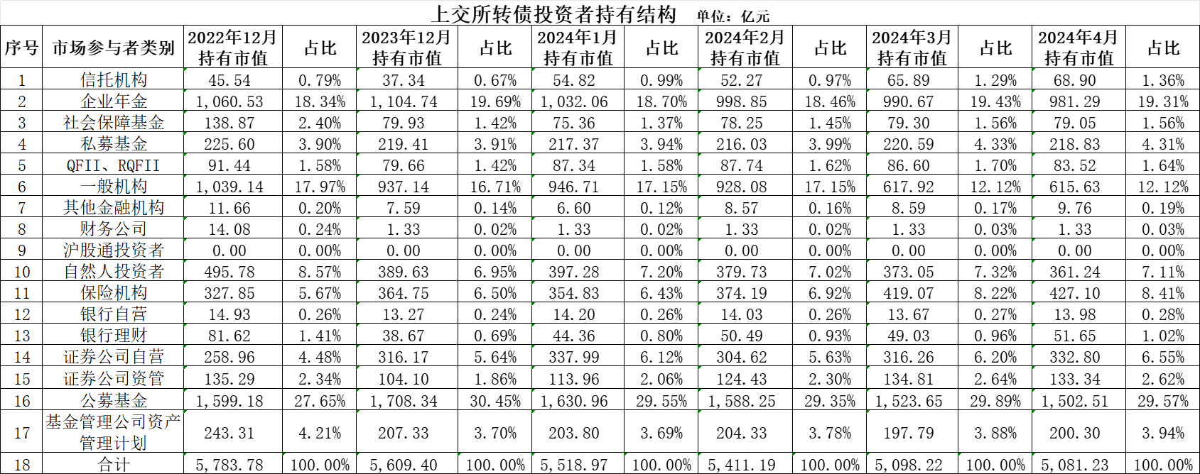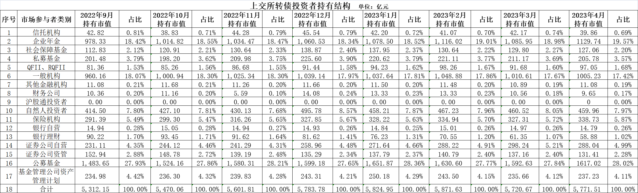 2023年4月,上交所转债投资者持有市值(债券面值)5,771.51亿元,其中公募基金持有市值占比28.02%,自然人投资者持有市值占比7.97%。