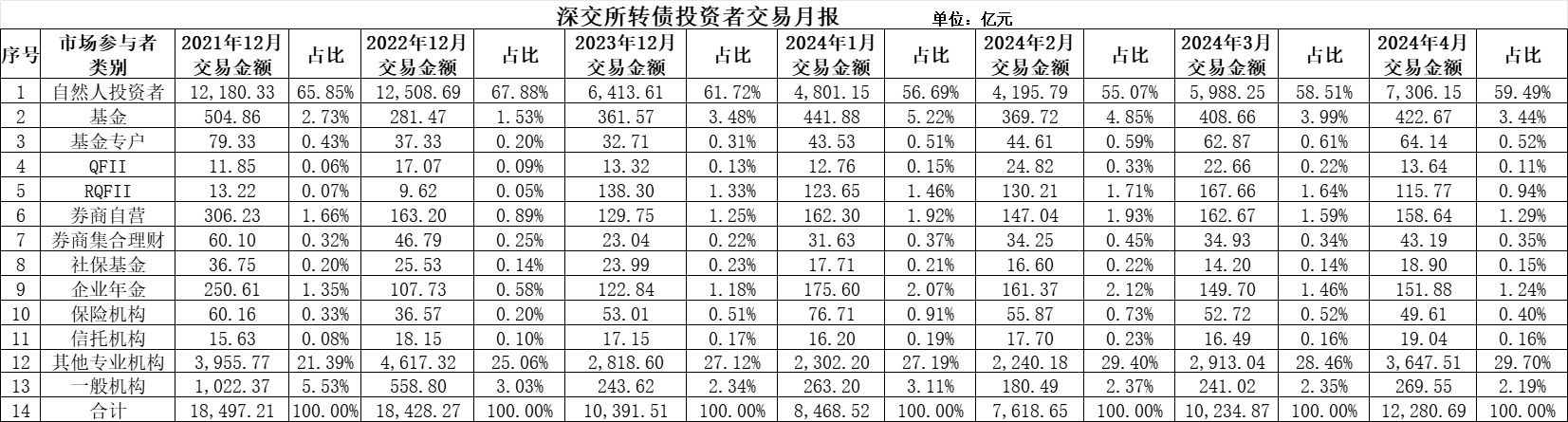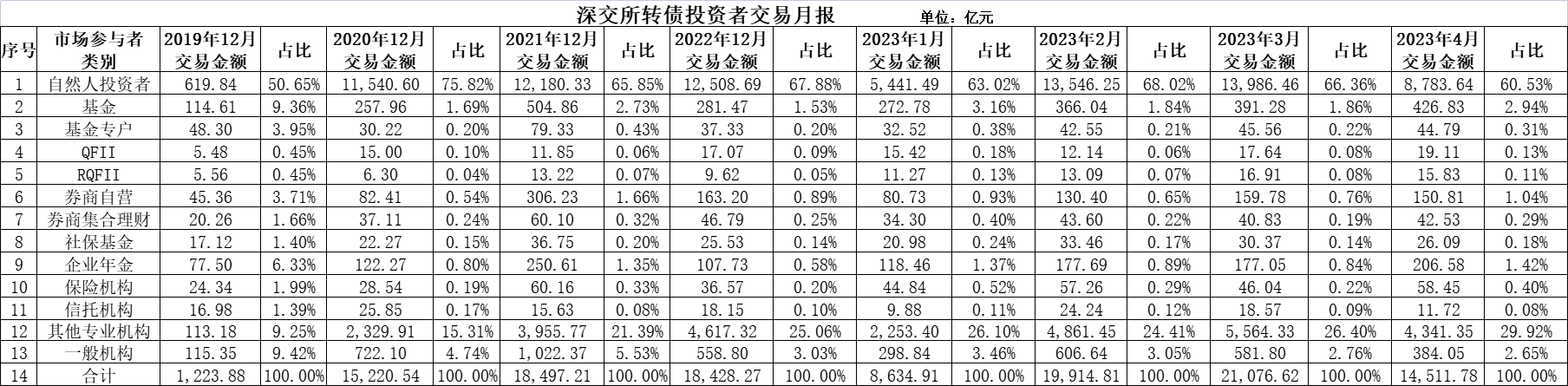 2023年4月,深交所转债投资者交易金额14,511.78亿元,其中基金(公募)交易金额占比2.94%,其他专业机构(私募)交易金额占比29.92%,自然人投资者交易金额占比60.53%。