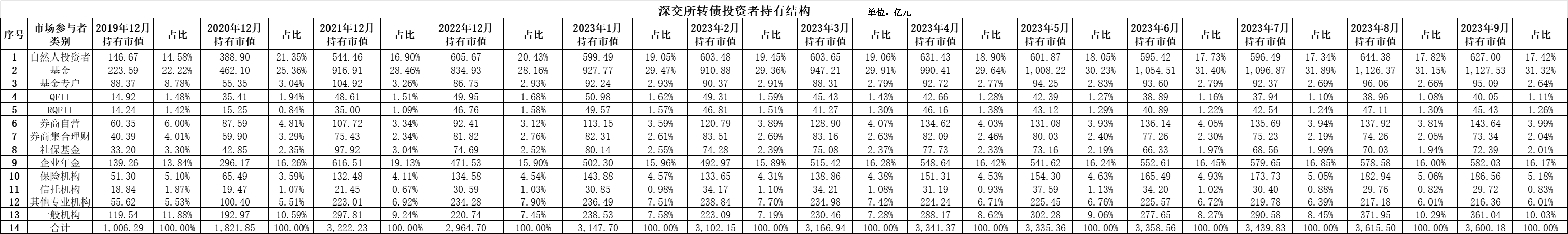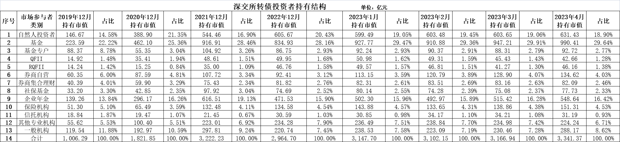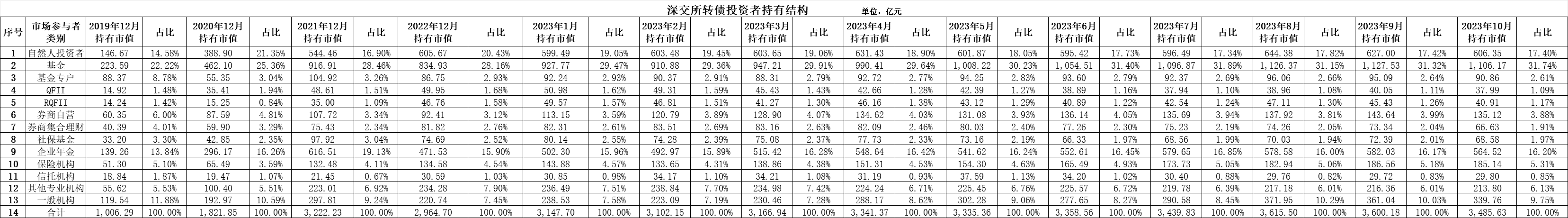 2023年4月,深交所转债投资者持有市值(债券市值)3,341.37 亿元,其中基金(公募)持有市值占比29.64%,其他专业机构(私募)持有市值占比6.71%,自然人投资者持有市值占比18.90%。