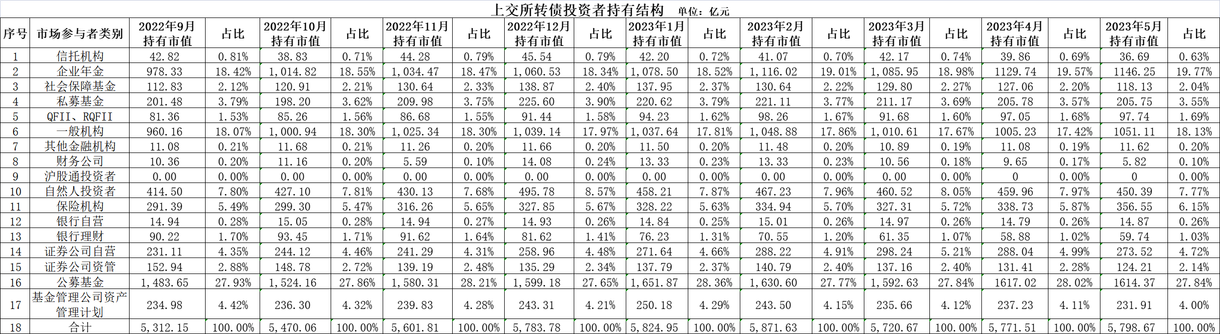 2023年5月,上交所转债投资者持有市值(债券面值)5,798.67 亿元,其中公募基金持有市值占比27.84%,自然人投资者持有市值占比7.77%。