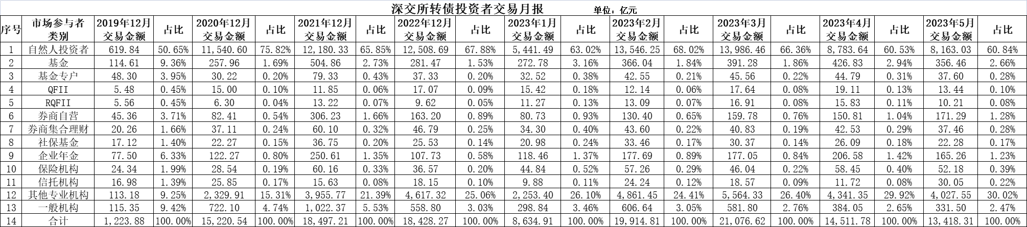 2023年5月,深交所转债投资者交易金额13,418.31亿元,其中基金(公募)交易金额占比2.66%,其他专业机构(私募)交易金额占比30.02%,自然人投资者交易金额占比60.84%。
