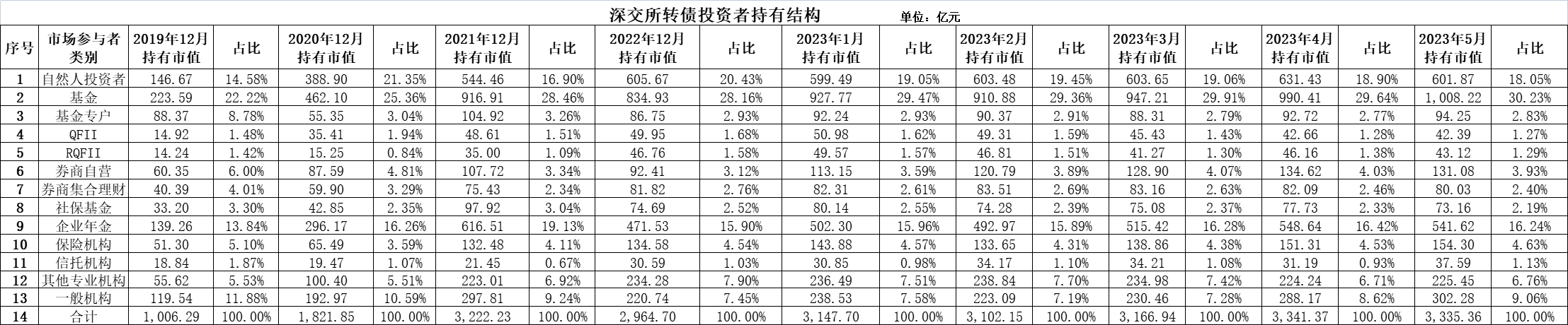 2023年5月,深交所转债投资者持有市值(债券市值)3,335.36 亿元,其中基金(公募)持有市值占比30.23%,其他专业机构(私募)持有市值占比6.76%,自然人投资者持有市值占比18.05%。