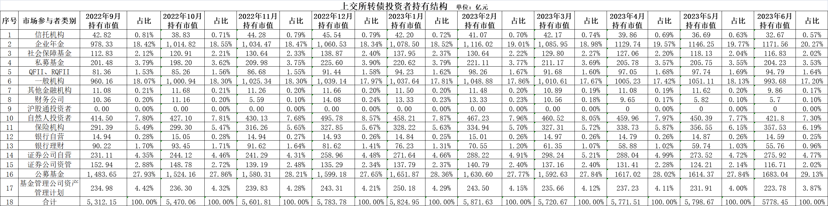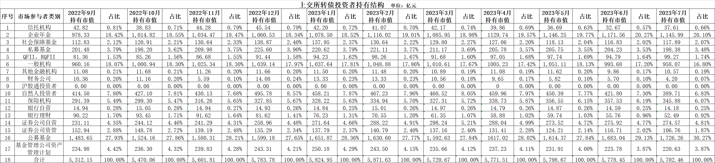 2023年7月,上交所转债投资者持有市值(债券面值)5,702.46 亿元,其中公募基金持有市值占比30.27%,自然人投资者持有市值占比6.83%。