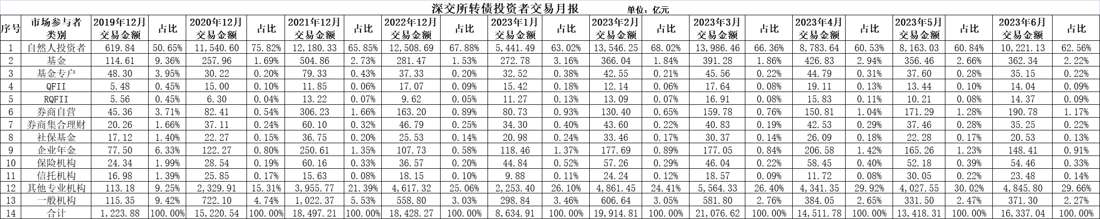 2023年6月,深交所转债投资者交易金额16,337.04亿元,其中基金(公募)交易金额占比2.22%,其他专业机构(私募)交易金额占比29.66%,自然人投资者交易金额占比62.56%。
