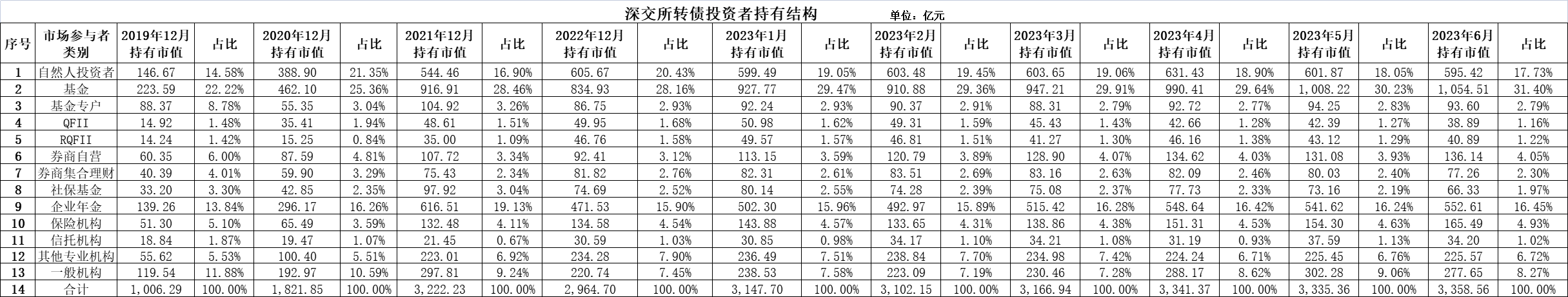 2023年6月,深交所转债投资者持有市值(债券市值)3,358.56 亿元,其中基金(公募)持有市值占比31.40%,其他专业机构(私募)持有市值占比6.72%,自然人投资者持有市值占比17.73%。
