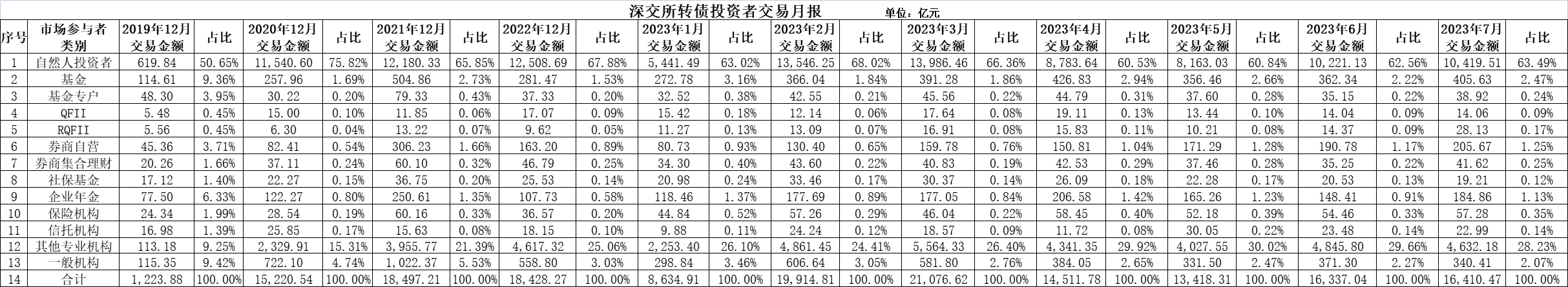 2023年7月,深交所转债投资者交易金额16,410.47亿元,其中基金(公募)交易金额占比2.47%,其他专业机构(私募)交易金额占比28.23%,自然人投资者交易金额占比63.49%。