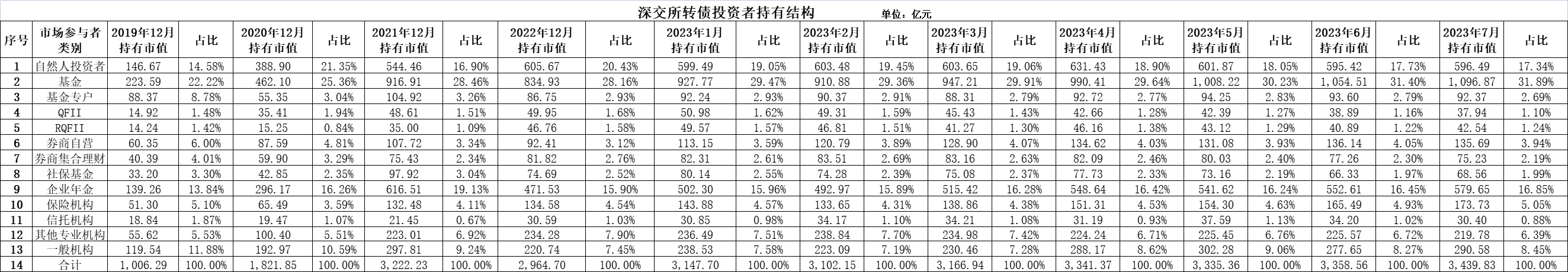 2023年7月,深交所转债投资者持有市值(债券市值)3,439.83 亿元,其中基金(公募)持有市值占比31.89%,其他专业机构(私募)持有市值占比6.39%,自然人投资者持有市值占比17.34%。