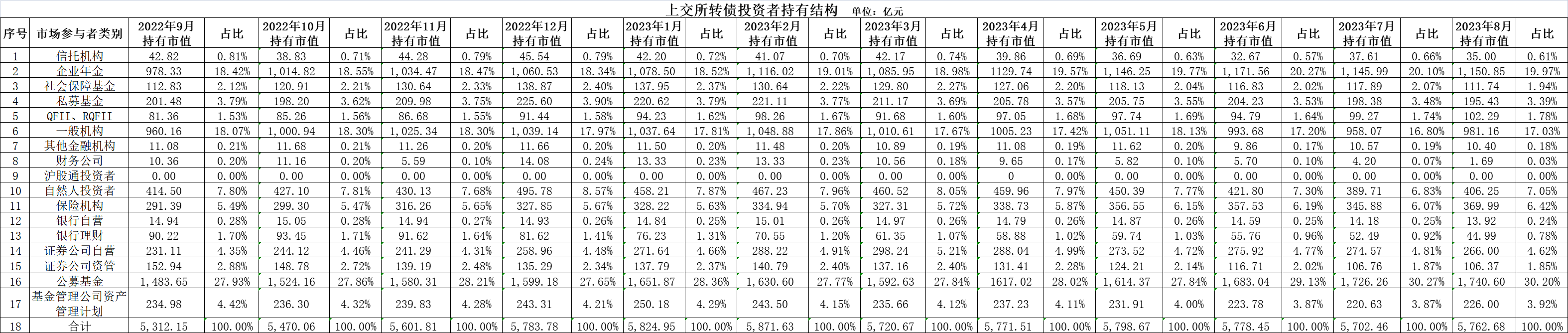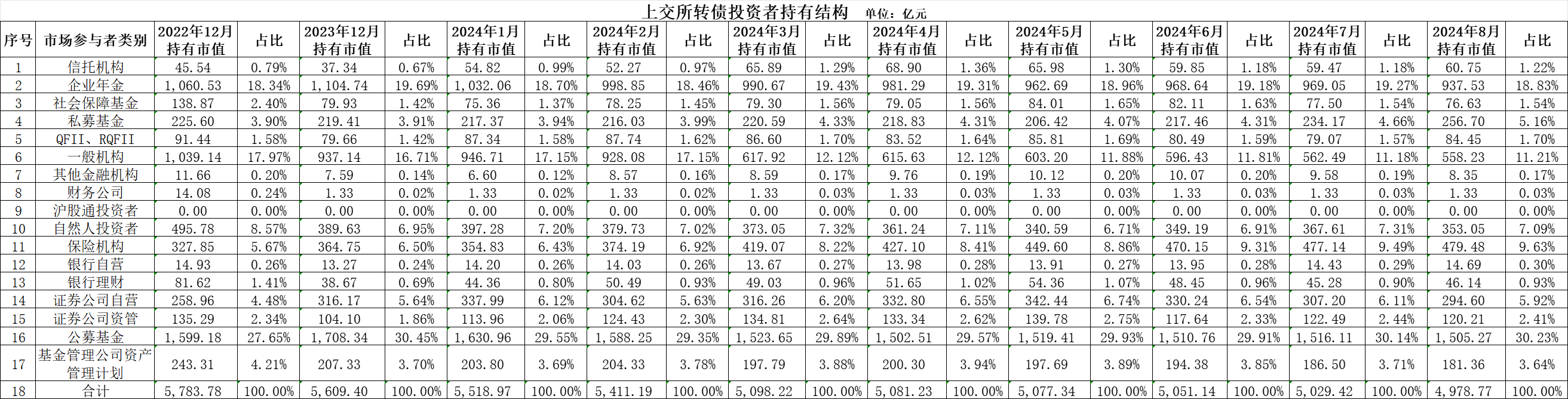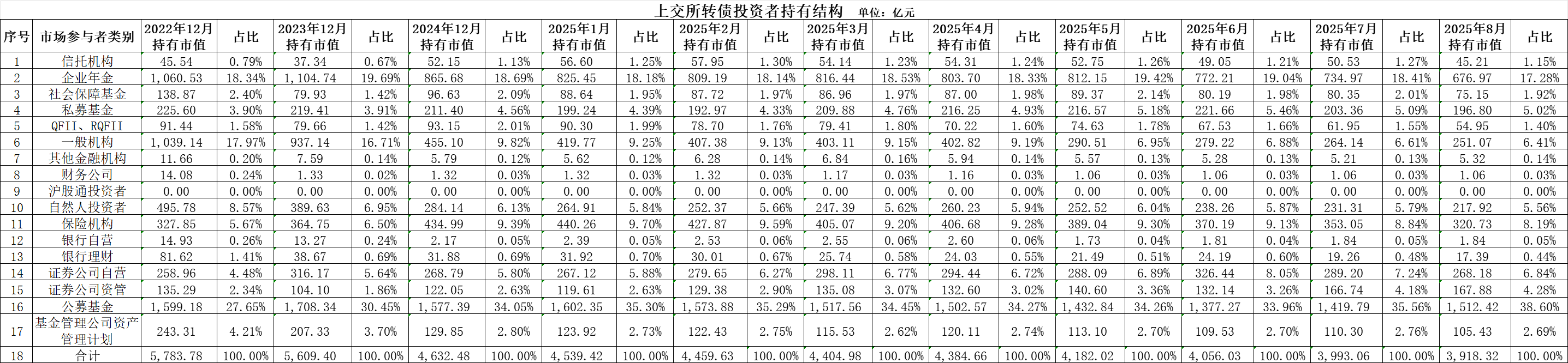 2025年8月,上交所转债投资者持有市值(债券面值)3,918.32亿元,其中公募基金持有市值占比38.60%,企业年金持有市值占比17.28%,自然人投资者持有市值占比5.56%,私募基金持有市值占比5.02%。
