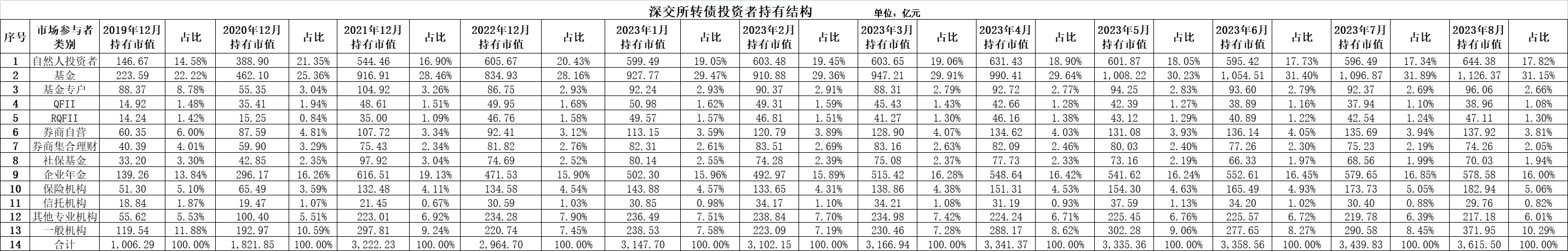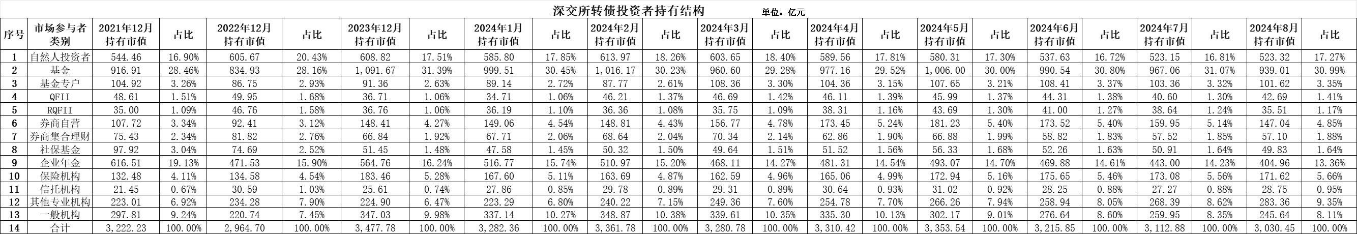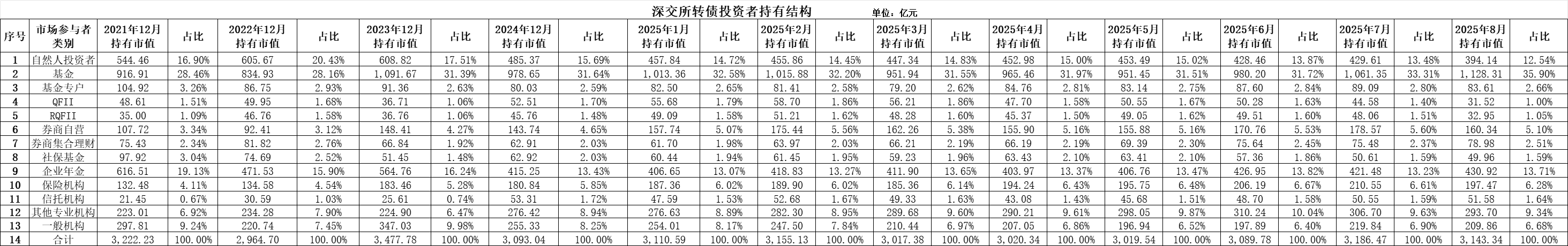 2025年8月,深交所转债投资者持有市值(债券市值)3,143.34亿元,其中基金(公募)持有市值占比35.90%,自然人投资者持有市值占比12.54%,企业年金持有市值占比13.71%,其他专业机构(私募)持有市值占比9.34%。