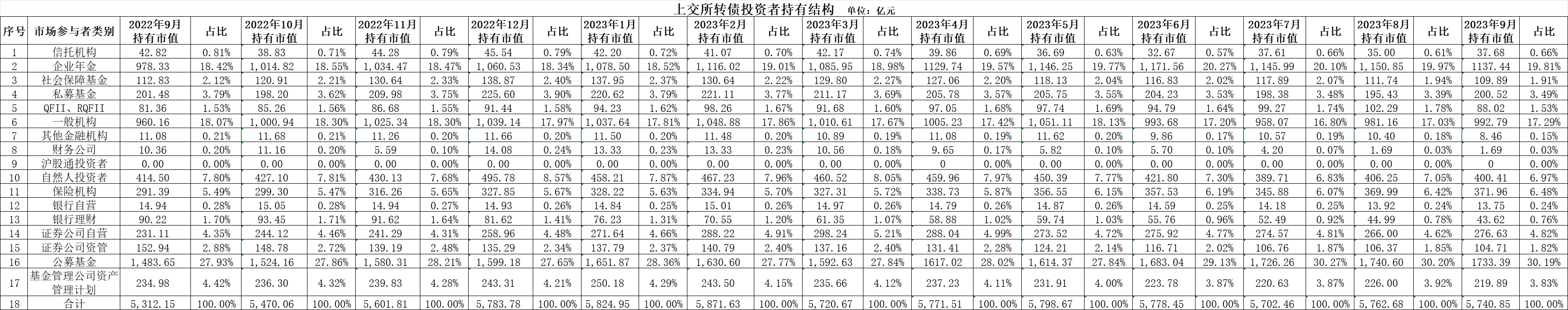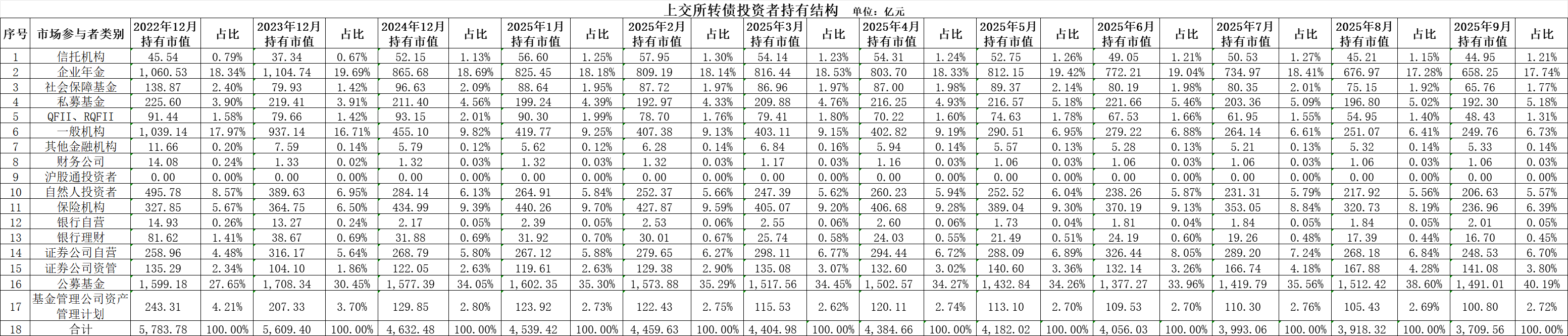 2025年9月,上交所转债投资者持有市值(债券面值)3,709.56亿元,其中公募基金持有市值占比40.19%,企业年金持有市值占比17.74%,自然人投资者持有市值占比5.57%,私募基金持有市值占比5.18%。