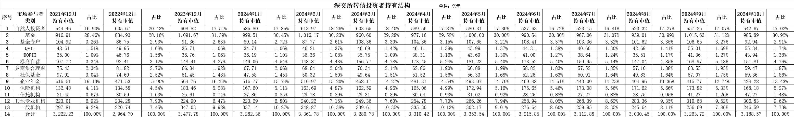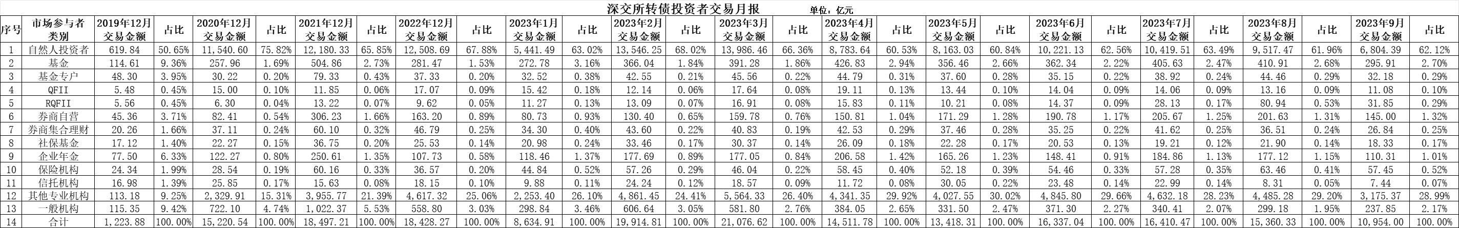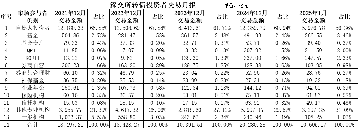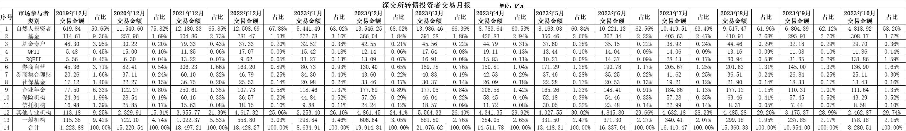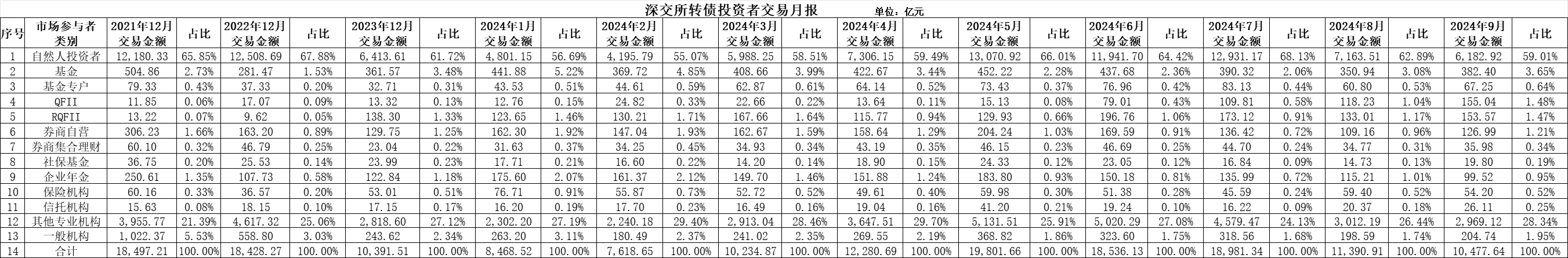 2025年10月,深交所转债投资者交易金额10,738.90亿元,其中基金(公募)交易金额占比4.22%,企业年金交易金额占比1.65%,自然人投资者交易金额占比49.59%,其他专业机构(私募)交易金额占比33.27%。