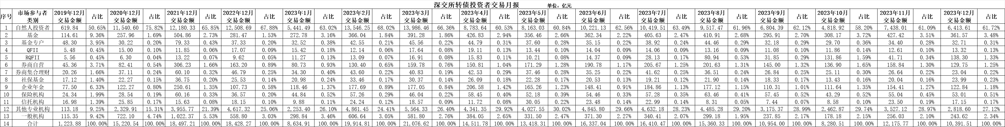 2019年12月,深交所转债投资者交易金额1,223.88亿元,其中基金交易金额占比9.36%,自然人投资者交易金额占比50.65%。