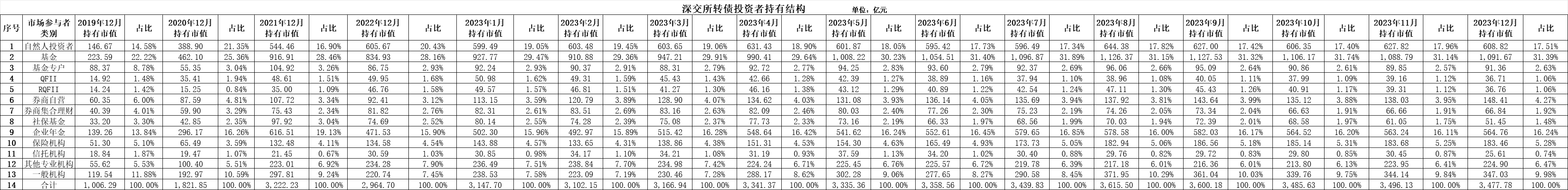2019年12月,深交所转债投资者持有市值(债券市值)1006.29亿元,其中基金持有市值占比22.22%,自然人投资者持有市值占比14.58%。
