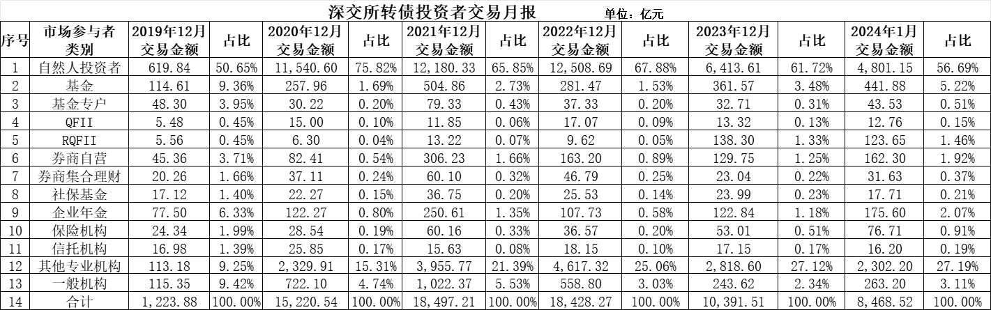 2020年12月,深交所转债投资者交易金额15,220.54亿元,其中基金交易金额占比1.69%,自然人投资者交易金额占比75.82%。