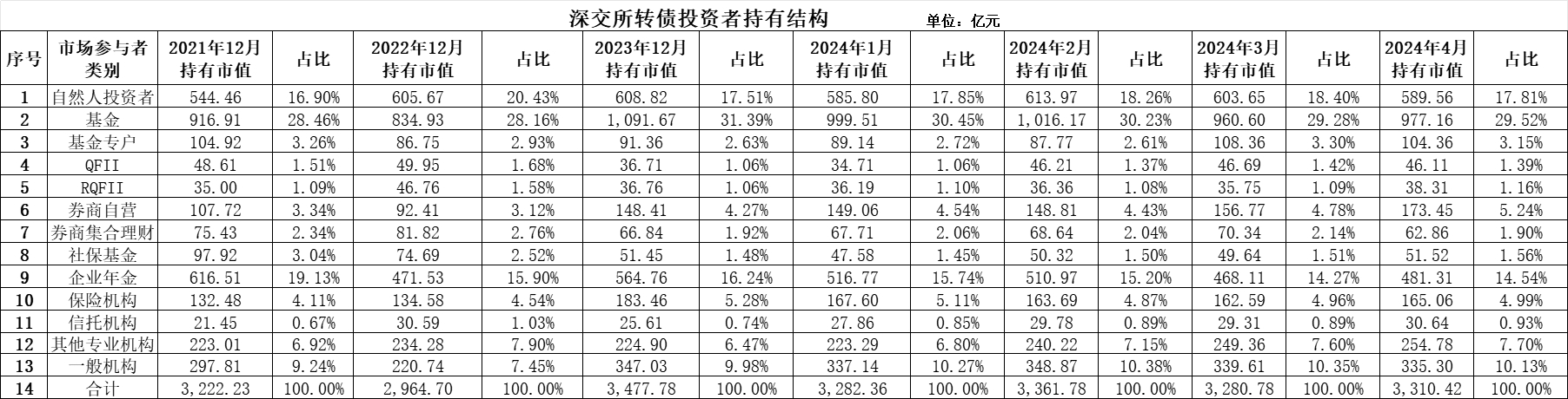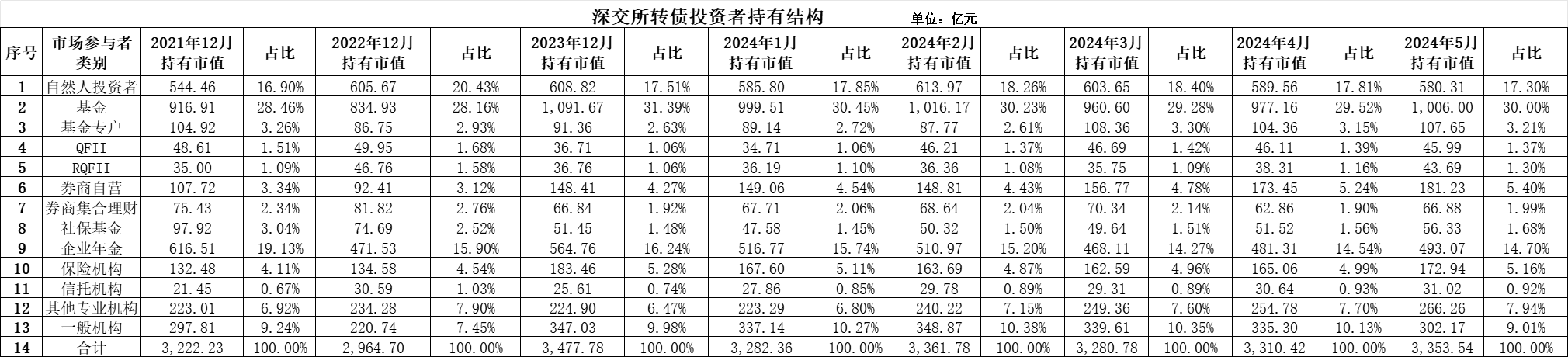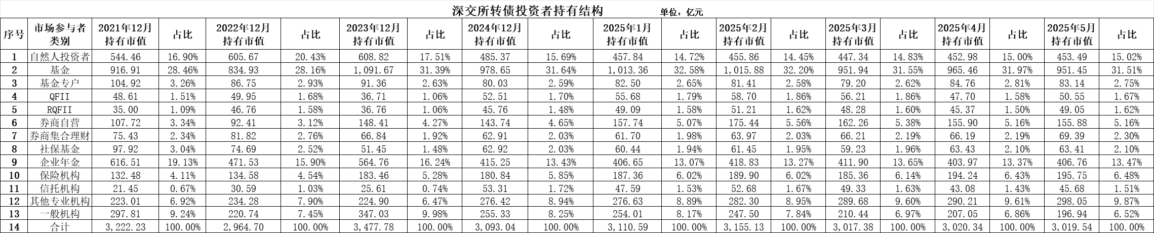 2025年5月,深交所转债投资者持有市值(债券市值)3,019.54亿元,其中基金(公募)持有市值占比31.51%,自然人投资者持有市值占比15.02%,企业年金持有市值占比13.47%,其他专业机构(私募)持有市值占比9.87%。