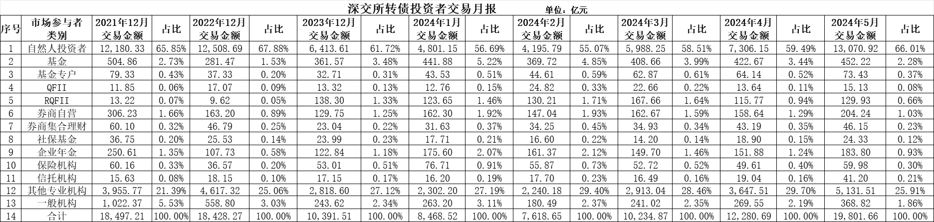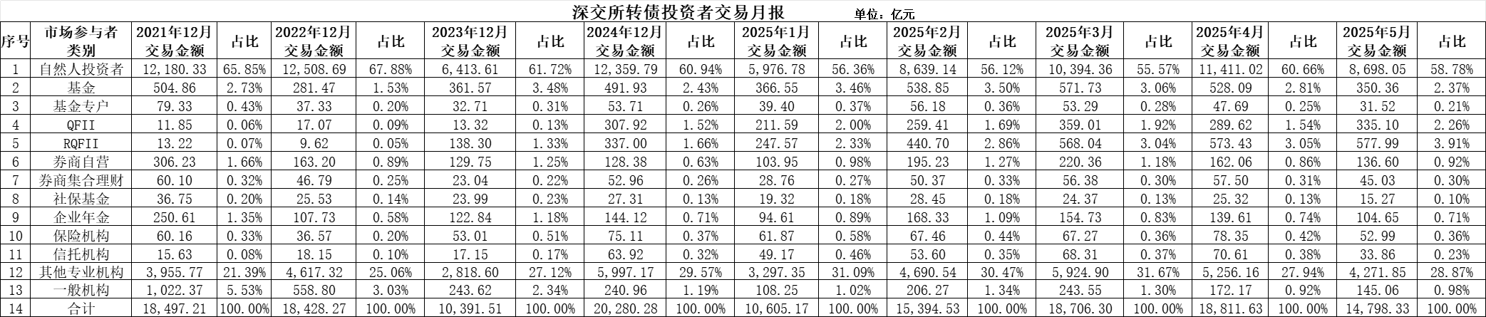 2025年5月,深交所转债投资者交易金额14,798.33亿元,其中基金(公募)交易金额占比2.37%,自然人投资者交易金额占比58.78%,企业年金交易金额占比0.71%,其他专业机构(私募)交易金额占比28.87%。