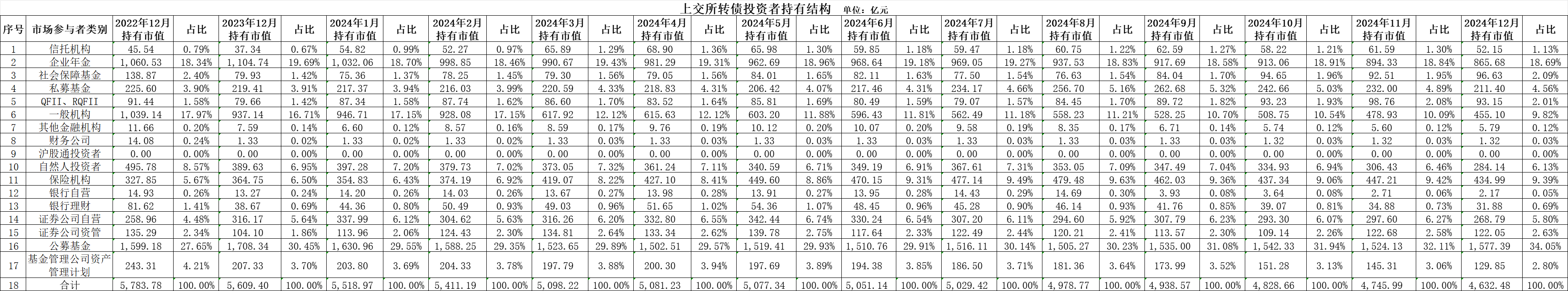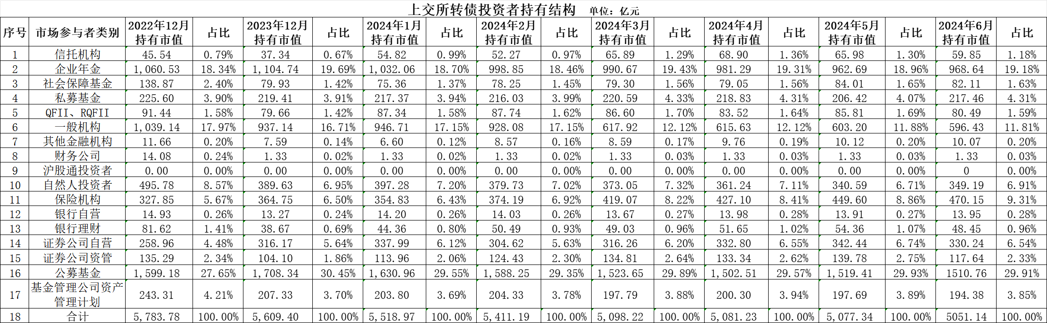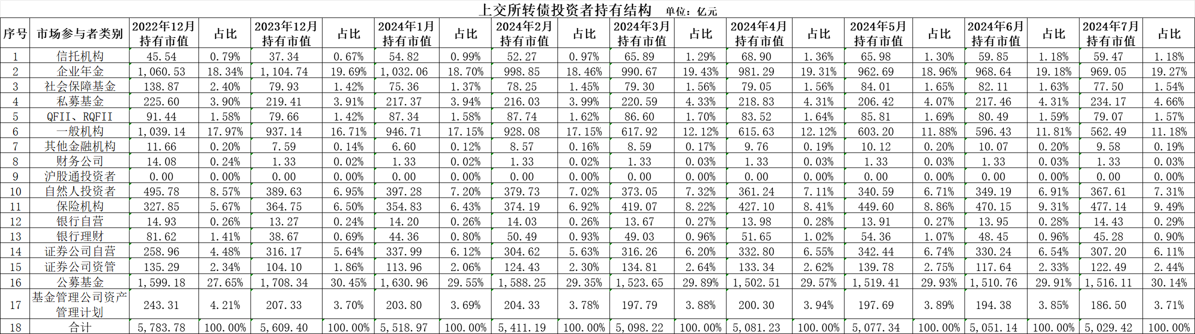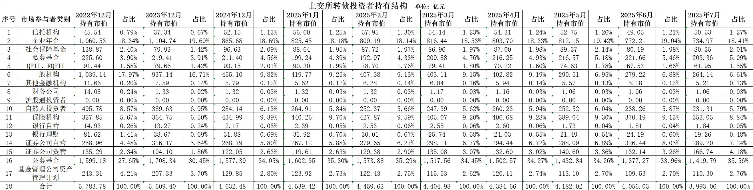 2025年7月,上交所转债投资者持有市值(债券面值)3,993.06亿元,其中公募基金持有市值占比35.56%,企业年金持有市值占比18.41%,自然人投资者持有市值占比5.79%,私募基金持有市值占比5.09%。