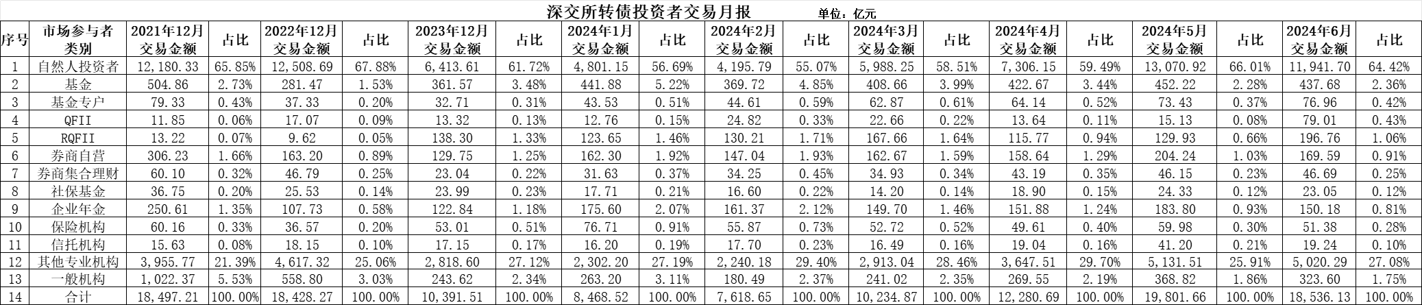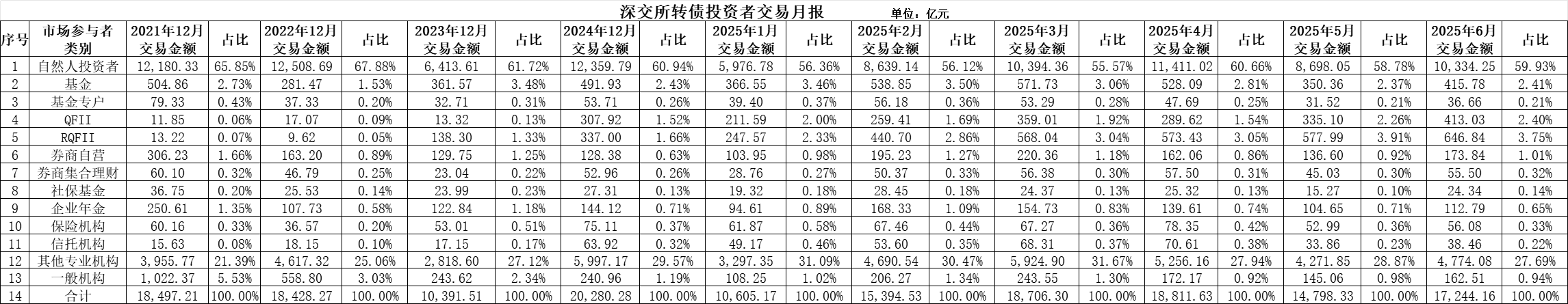 2025年6月,深交所转债投资者交易金额17,244.16亿元,其中基金(公募)交易金额占比2.41%,自然人投资者交易金额占比59.93%,企业年金交易金额占比0.65%,其他专业机构(私募)交易金额占比27.69%。