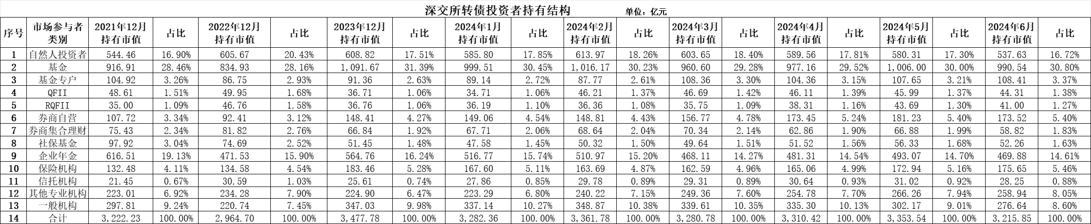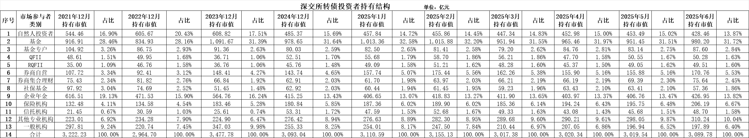 2025年6月,深交所转债投资者持有市值(债券市值)3,089.78亿元,其中基金(公募)持有市值占比31.72%,自然人投资者持有市值占比13.87%,企业年金持有市值占比13.82%,其他专业机构(私募)持有市值占比10.04%。