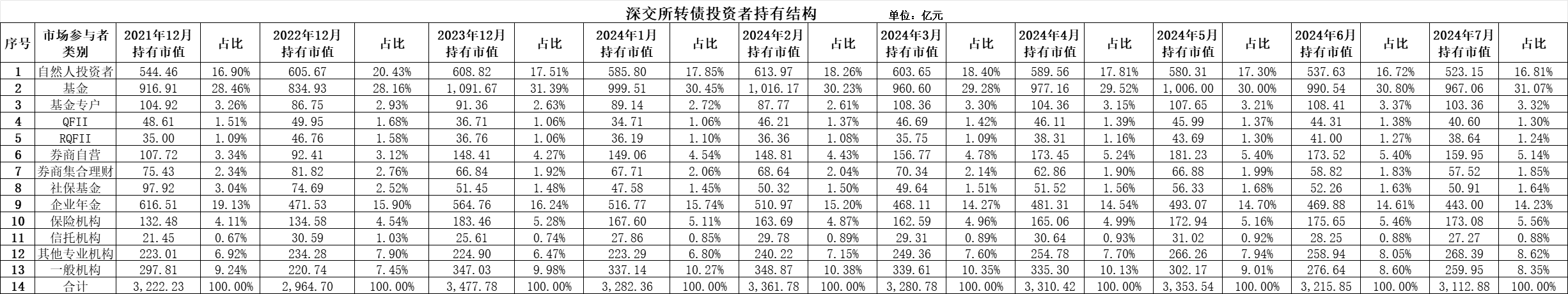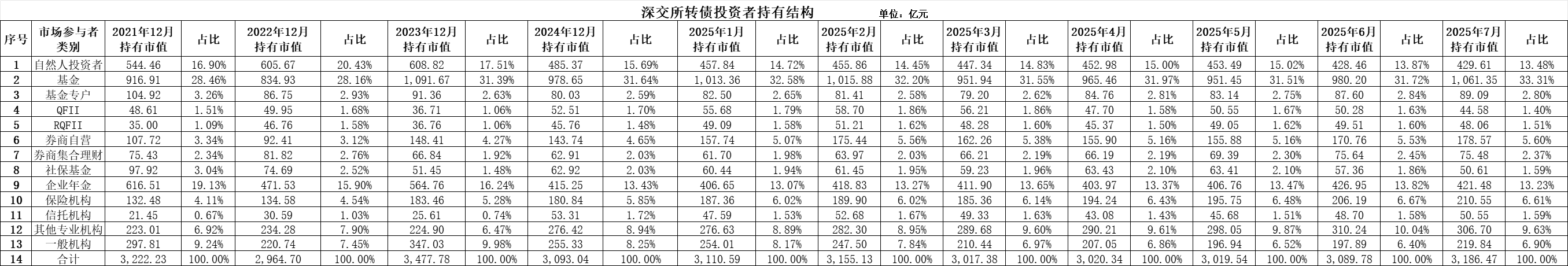 2025年7月,深交所转债投资者持有市值(债券市值)3,186.47亿元,其中基金(公募)持有市值占比33.31%,自然人投资者持有市值占比13.48%,企业年金持有市值占比13.23%,其他专业机构(私募)持有市值占比9.63%。