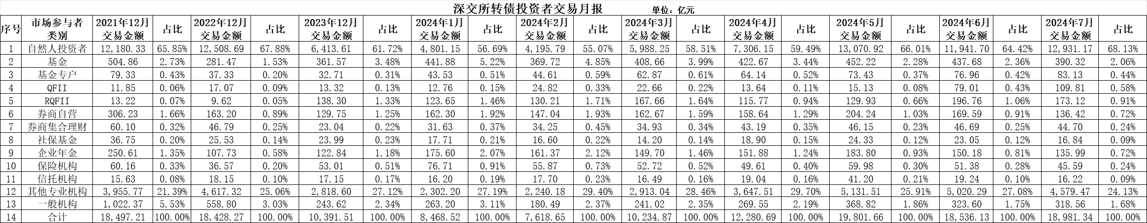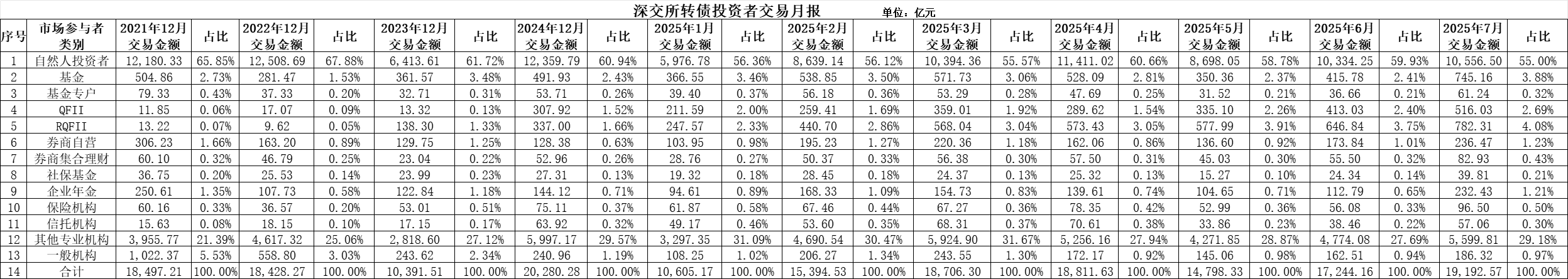 2025年7月,深交所转债投资者交易金额19,192.57亿元,其中基金(公募)交易金额占比3.88%,自然人投资者交易金额占比55.00%,企业年金交易金额占比1.21%,其他专业机构(私募)交易金额占比29.18%。