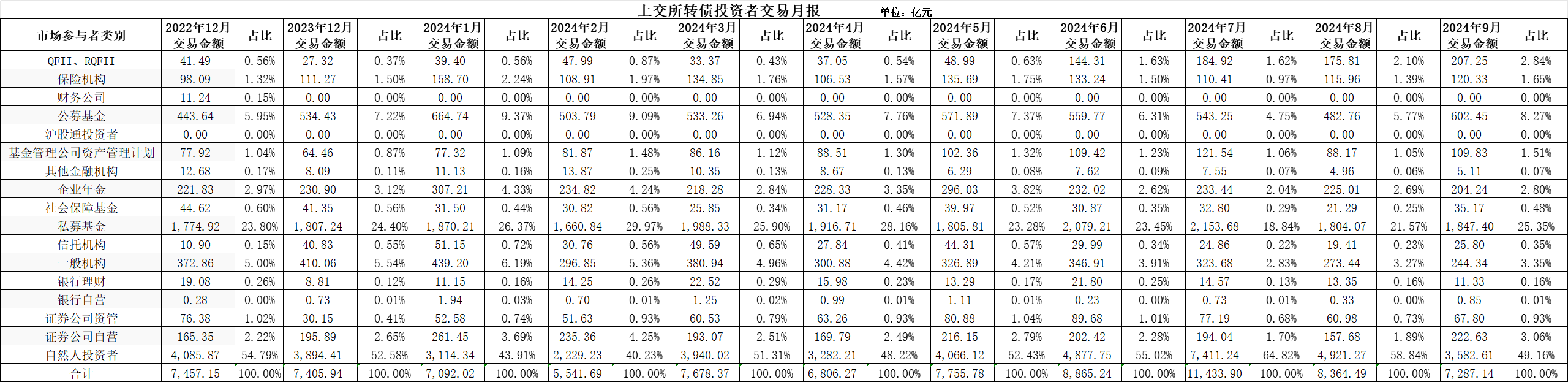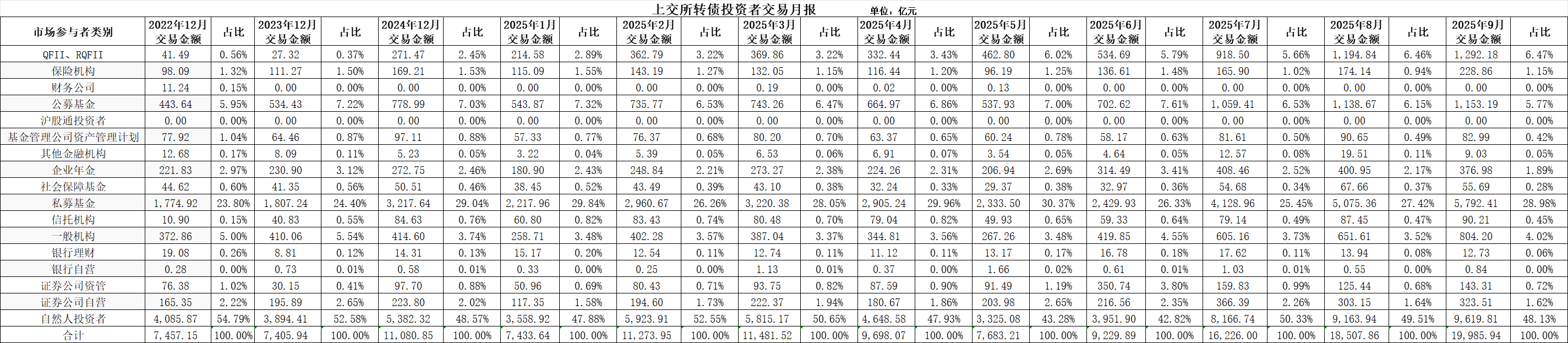 2025年9月,上交所转债投资者交易金额19,985.94亿元,其中公募基金交易金额占比5.77%,自然人投资者交易金额占比48.13%,企业年金交易金额占比1.89%,私募基金交易金额占比28.98%。