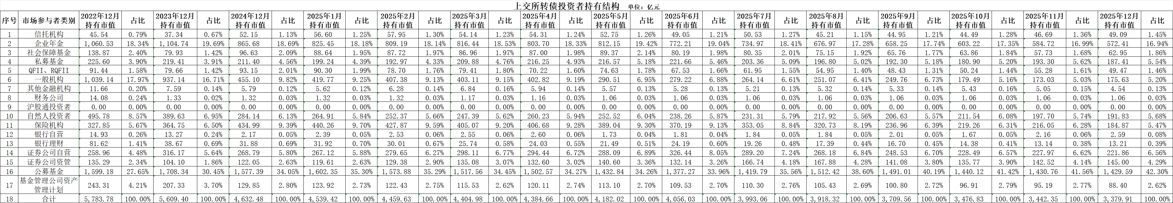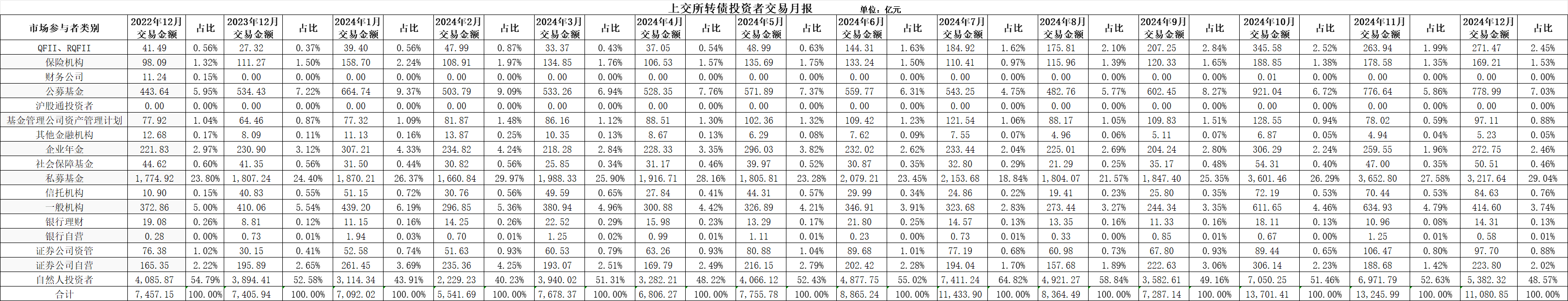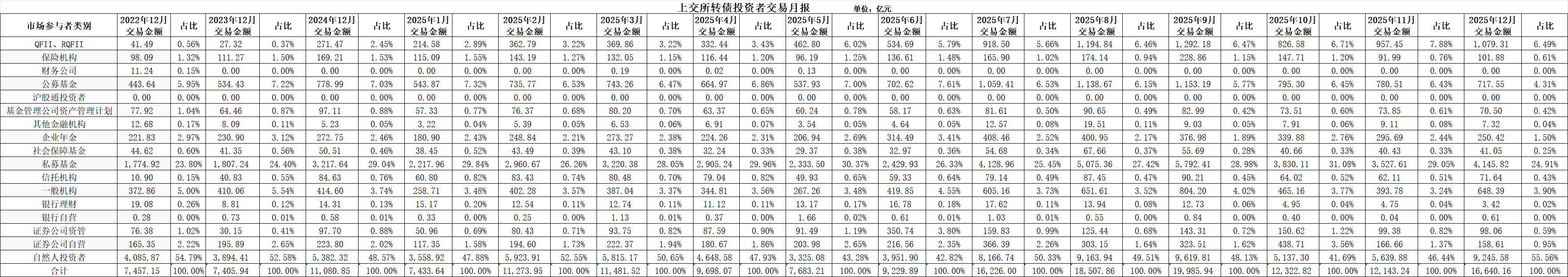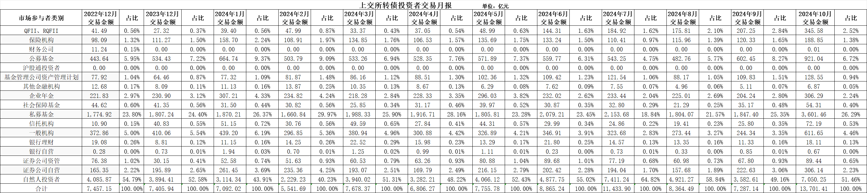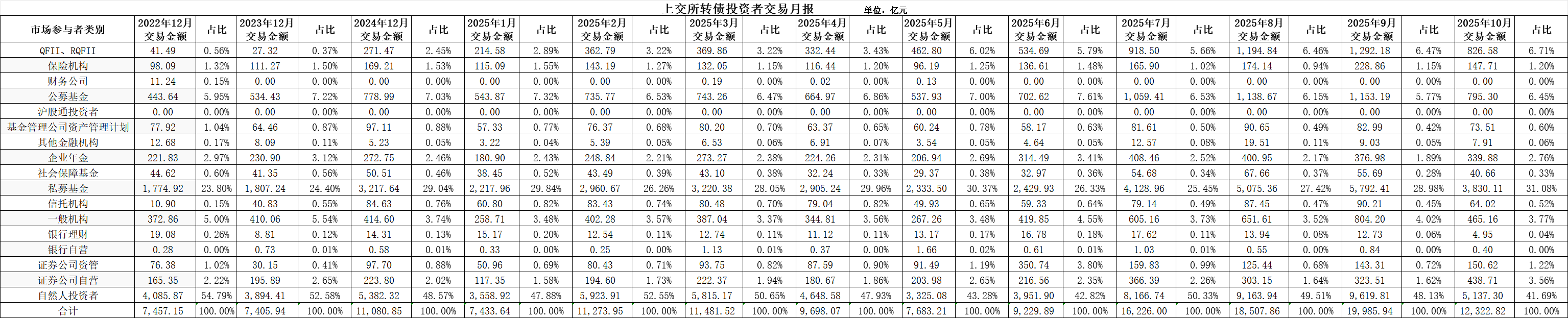 2025年10月,上交所转债投资者交易金额12,322.82亿元,其中公募基金交易金额占比6.45%,企业年金交易金额占比2.76%,自然人投资者交易金额占比41.69%,私募基金交易金额占比31.08%。