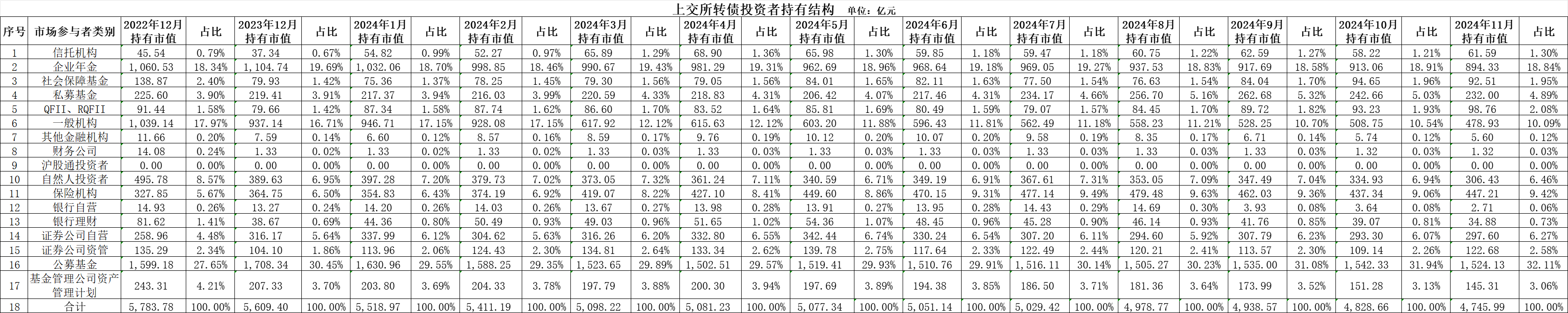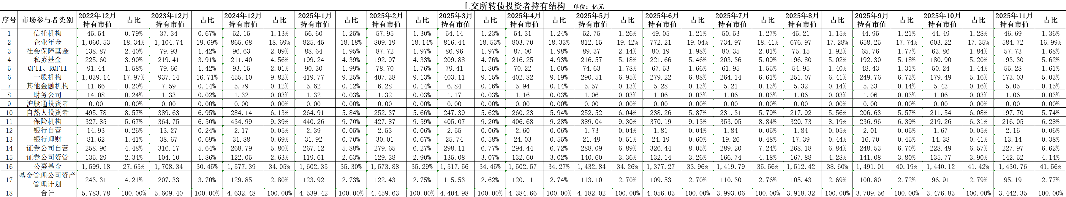 2025年11月,上交所转债投资者持有市值(债券面值)3,442.35亿元,其中公募基金持有市值占比41.56%,企业年金持有市值占比16.99%,自然人投资者持有市值占比5.74%,私募基金持有市值占比5.62%。