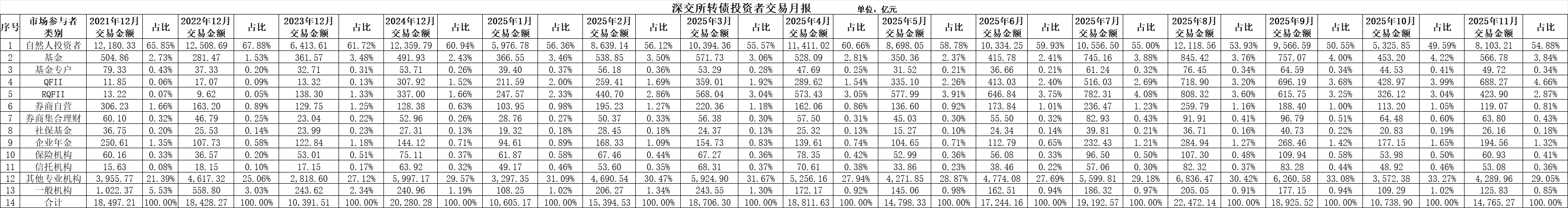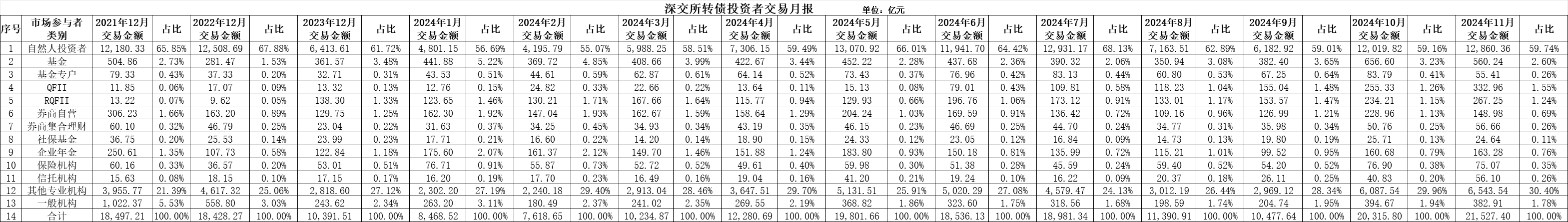 2025年11月,深交所转债投资者交易金额14,765.27亿元,其中基金(公募)交易金额占比3.84%,企业年金交易金额占比1.32%,自然人投资者交易金额占比54.88%,其他专业机构(私募)交易金额占比29.05%。