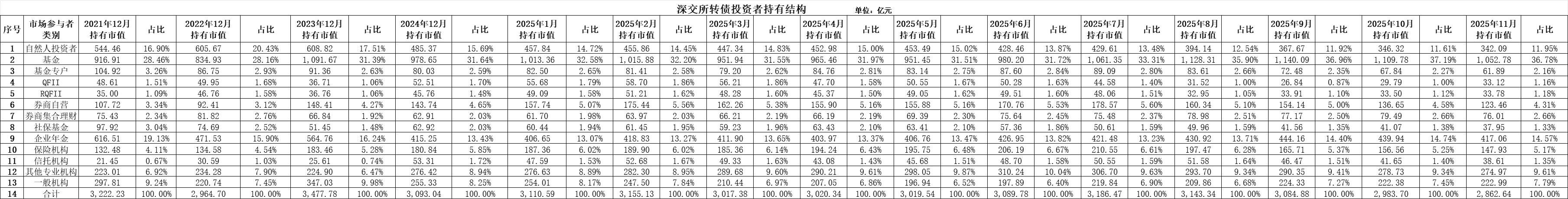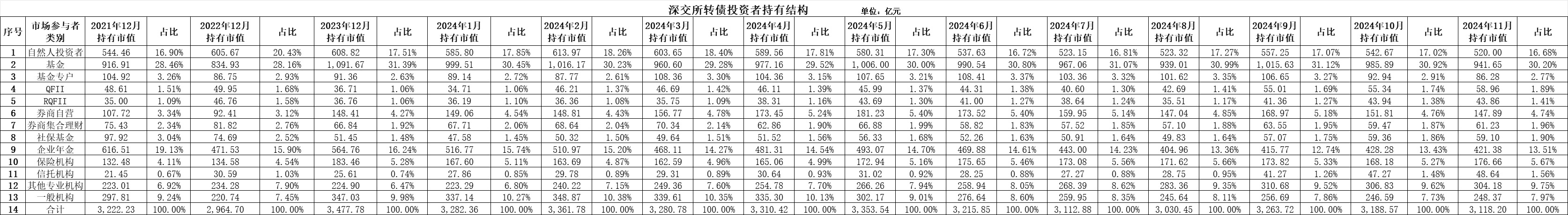 2025年11月,深交所转债投资者持有市值(债券市值)2,862.64亿元,其中基金(公募)持有市值占比36.78%,企业年金持有市值占比14.57%,自然人投资者持有市值占比11.95%,其他专业机构(私募)持有市值占比9.61%。