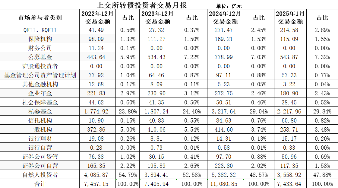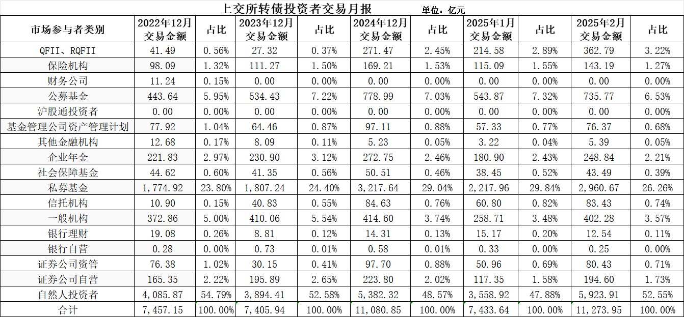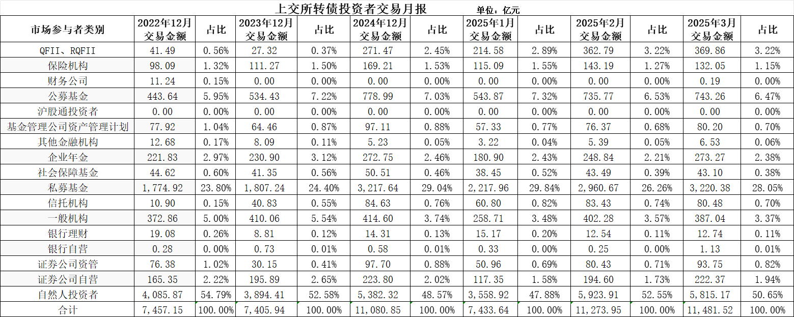 2025年3月,上交所转债投资者交易金额11,481.52亿元,其中公募基金交易金额占比6.47%,自然人投资者交易金额占比50.65%,企业年金交易金额占比2.38%,私募基金交易金额占比28.05%。