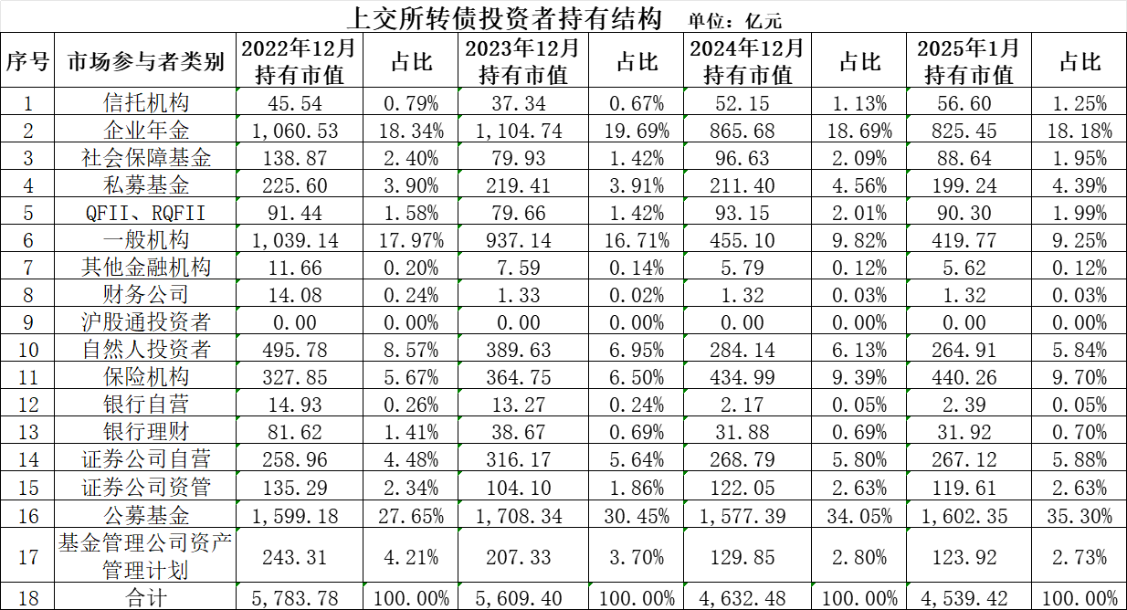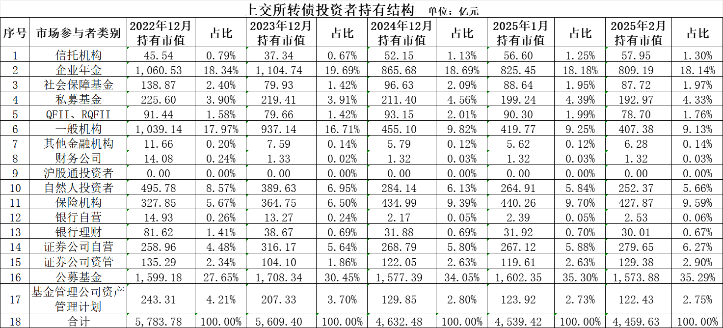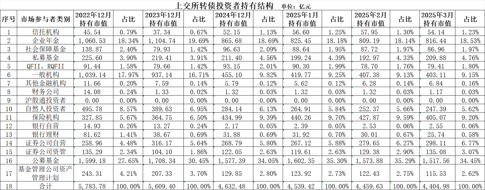 2025年3月,上交所转债投资者持有市值(债券面值)4,404.98亿元,其中公募基金持有市值占比34.45%,企业年金持有市值占比18.53%,自然人投资者持有市值占比5.62%,私募基金持有市值占比4.76%。