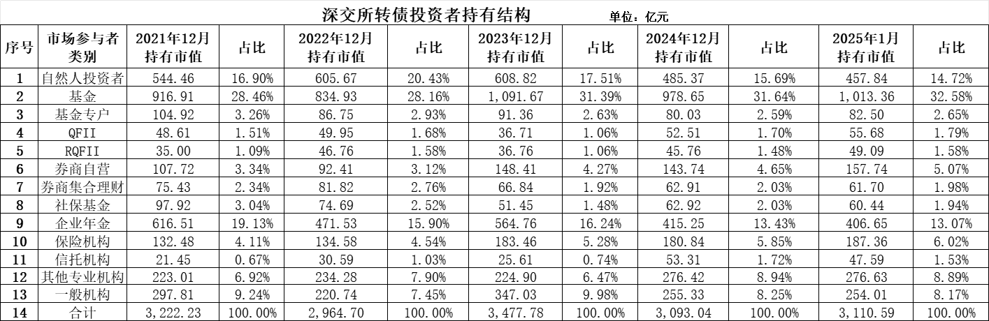 2025年2月,深交所转债投资者持有市值(债券市值)3,155.13亿元,其中基金(公募)持有市值占比32.20%,自然人投资者持有市值占比14.45%,企业年金持有市值占比13.27%,其他专业机构(私募)持有市值占比8.95%。