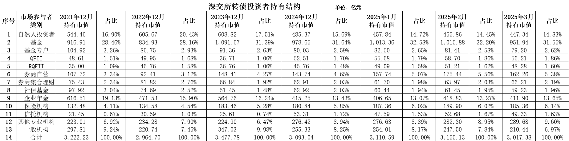 2025年3月,深交所转债投资者持有市值(债券市值)3,017.38亿元,其中基金(公募)持有市值占比31.55%,自然人投资者持有市值占比14.83%,企业年金持有市值占比13.65%,其他专业机构(私募)持有市值占比9.60%。