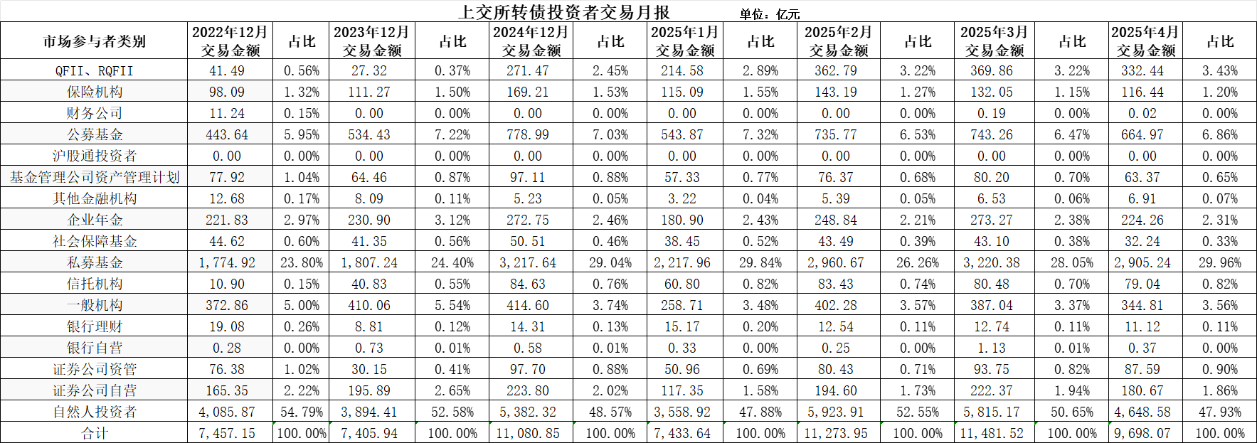 2025年4月,上交所转债投资者交易金额9,698.07亿元,其中公募基金交易金额占比6.86%,自然人投资者交易金额占比47.93%,企业年金交易金额占比2.31%,私募基金交易金额占比29.96%。